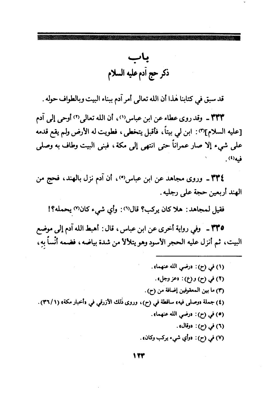 334- وروى مجاهد عن ابن عباس، أن آدم نَزَلَ بِالْهِنْدِ، فَحَجَّ مِنَ الْهِنْدِ أَرْبَعِينَ حَجَّةً عَلَى رِجْلَيْهِ.
