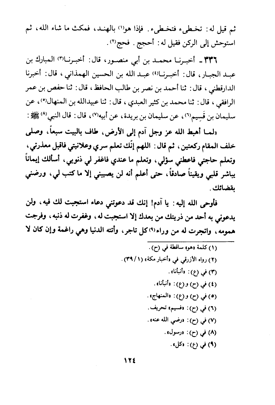 ((لَمَّا أَهْبَطَ اللَّهُ عَزَّ وَجَلَّ آدَمَ إِلَى الأَرْضِ، طَافَ بِالْبَيْتِ سَبْعًا، وَصَلَّى خَلْفَ الْمَقَامِ رَكْعَتَيْنِ، ثُمَّ قَالَ: اللَّهُمَّ إِنَّكَ تَعْلَمُ سِرِّي وَعَلانِيَتِي فَاقْبَلْ مَعْذِرَتِي، وَتَعْلَمُ حَاجَتِي فَاعْطِنِي سُؤْلِي، وَتَعْلَمُ مَا عِنْدِي فَاغْفِرْ لِي ذُنُوبِي، أَسْأَلُكَ إِيمَانًا يُبَاشِرُ قَلْبِي وَيَقِينًا صَادِقًا، حَتَّى أَعْلَمَ أَنَّهُ لن يصيبني إلا ما كتب لي، ورضني بقضائك.