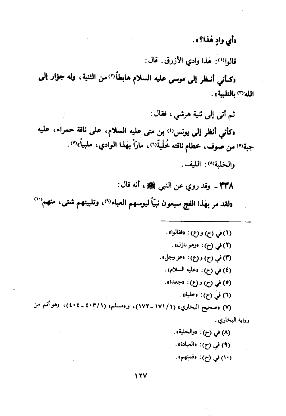 ((كأني أنظر إلى يونس بن متى عليه السلام، على ناقة حمراء، عَلَيْهِ جُبَّةٌ مِنْ صُوفٍ، خِطَامُ نَاقَتِهِ خلبةٌ، ماراً بهذا الوادي، ملبياً)) .