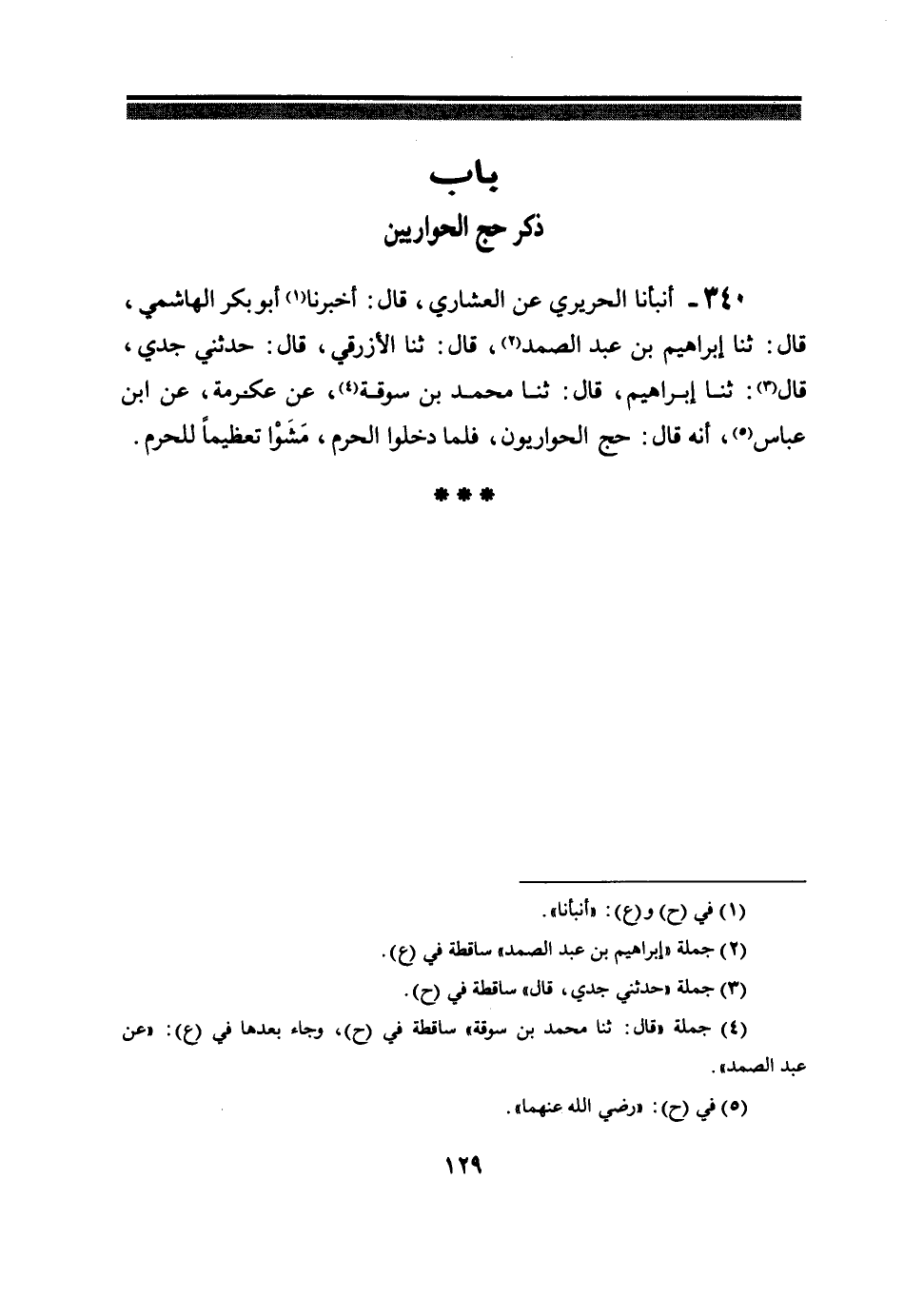 340- أَنْبَأنَا الْحَرِيرِيُّ عَنِ العشاري، قال: أخبرنا أبو بكر الهاشمي، قال: ثنا إبراهيم بن عبد الصمد، قال: ثنا الأزرقي، قال: حدثني جدي، قال: ثنا إبراهيم، قال: ثنا مُحَمَّدُ بْنُ سُوقَةَ، عِنْ عِكْرِمَةَ، عَنِ ابْنِ عباس، أَنَّهُ قَالَ: حَجَّ الْحَوَارِيُّونَ، فَلَمَّا دَخَلُوا الْحَرَمَ، مشوا تعظيماً للحرم.