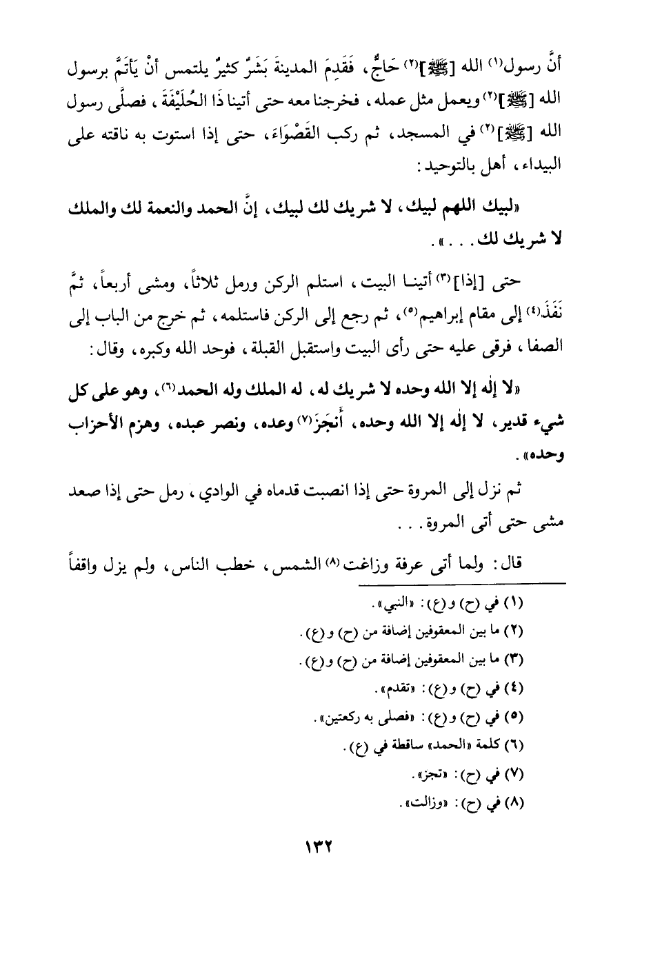 إن رسول الله [صلى الله عليه وسلم] حاج، فقدم المدينة بشرٌ كثيرٌ يَلْتَمِسُ أَنْ يَأْتَمَّ بِرَسُولِ اللَّهِ [صَلَّى اللَّهُ عَلَيْهِ وَسَلَّمَ] وَيَعْمَلَ مِثْلَ عَمَلِهِ، فَخَرَجْنَا مَعَهُ حَتَّى أَتَيْنَا ذَا الْحُلَيْفَةِ، فَصَلَّى رَسُولُ اللَّهِ صَلَّى اللَّهُ عَلَيْهِ وَسَلَّمَ فِي الْمَسْجِدِ، ثُمَّ رَكَبَ الْقَصْوَاءَ، حَتَّى إِذَا اسْتَوَتْ بِهِ نَاقَتُهُ عَلَى الْبَيْدَاءِ، أَهَلَّ بِالتَّوْحِيدِ:
