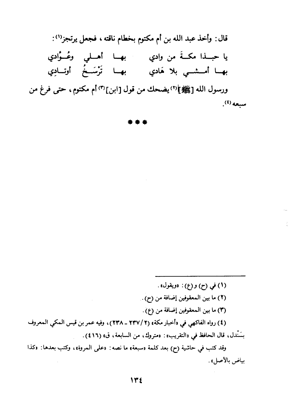 قَالَ: وَأَخَذَ عَبْدُ اللَّهِ بْنُ أُمِّ مَكْتُومٍ بخطام ناقته، فجعل يرتجز: