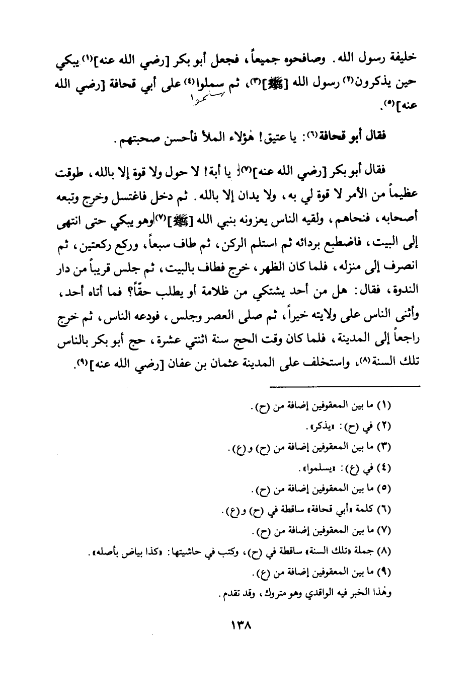 خَلِيفَةَ رَسُولِ اللَّهِ. وَصَافَحُوهُ جَمِيعًا، فَجَعَلَ أَبُو بكر [رضي الله عنه] يَبْكِي حِينَ يَذْكُرُونَ رَسُولَ اللَّهِ [صَلَّى اللَّهُ عليه وسلم] ، ثم سملوا على أبي قحافة [رضي الله عنه] .