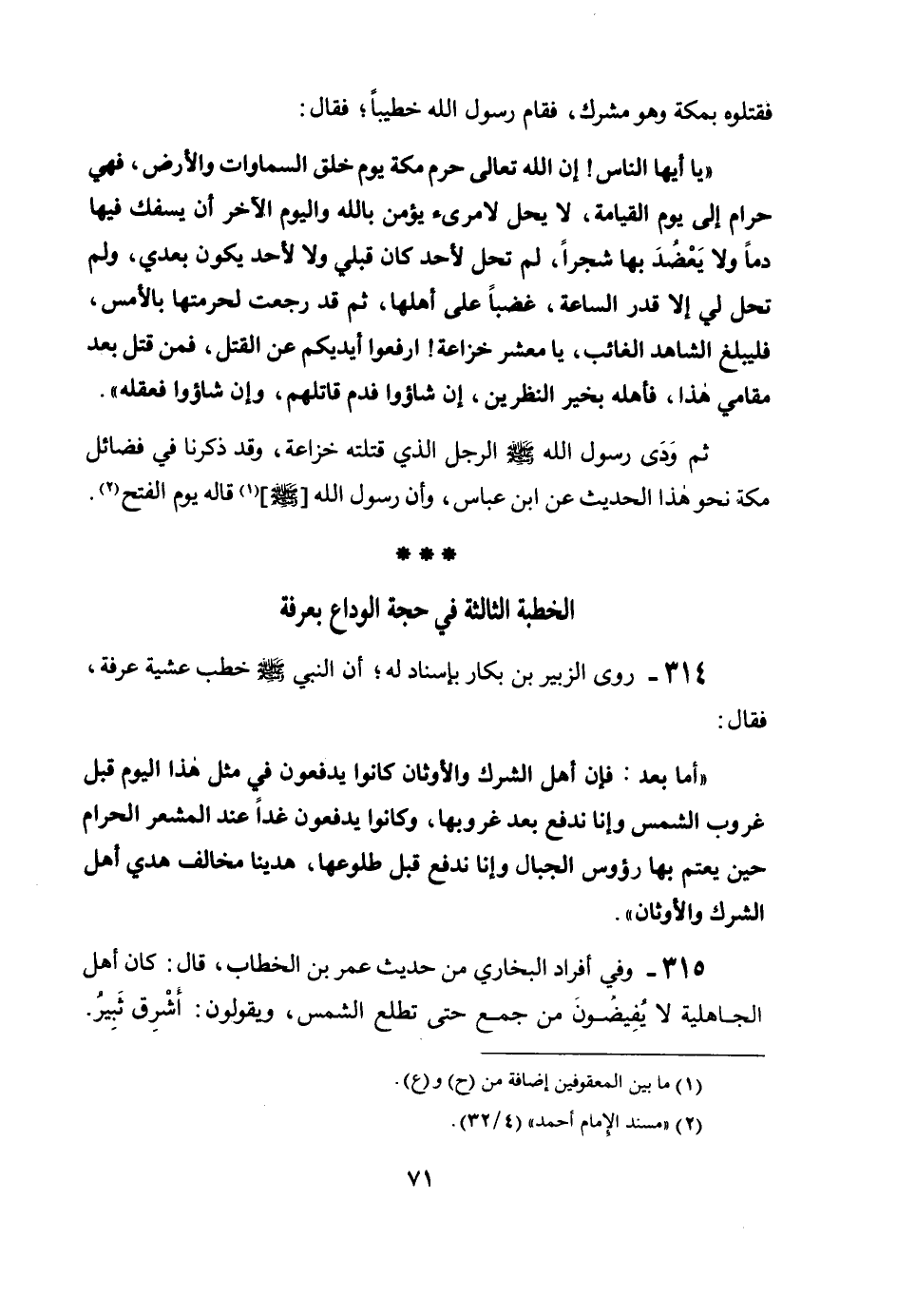314- رَوَى الزُّبَيْرُ بْنُ بَكَّارٍ بِإِسْنَادٍ لَهُ؛ أَنَّ النَّبِيَّ صَلَّى اللَّهُ عَلَيْهِ وَسَلَّمَ خَطَبَ عَشِيَّةَ عَرَفَةَ، فَقَالَ: