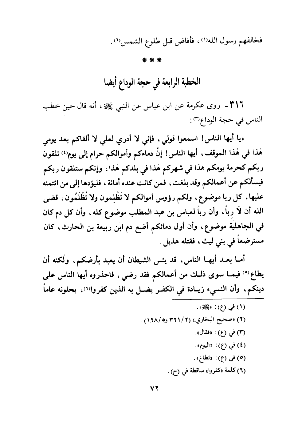 316- رَوَى عِكْرِمَةُ عَنِ ابْنِ عَبَّاسٍ عَنِ النَّبِيِّ صَلَّى اللَّهُ عَلَيْهِ وَسَلَّمَ، أَنَّهُ قَالَ: حِينَ خَطَبَ النَّاسَ فِي حَجَّةِ الوداع.