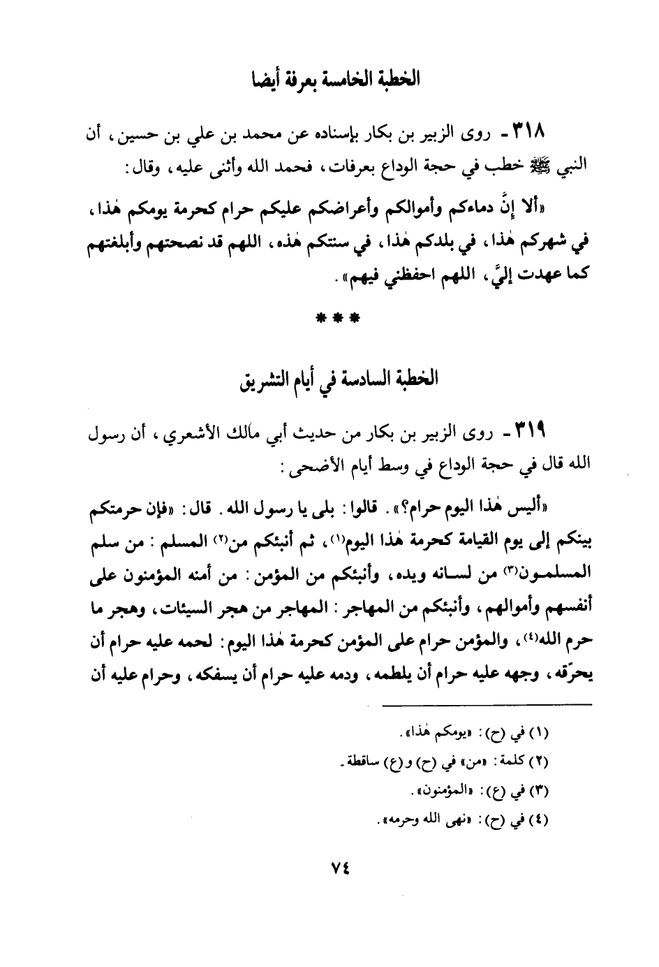 319- رَوَى الزُّبَيْرُ بْنُ بَكَّارٍ مِنْ حَدِيثِ أَبِي مالك الأشعري، أن رسول الله قال في حجة الوداع في وسط أَيَّامِ الأَضْحَى: