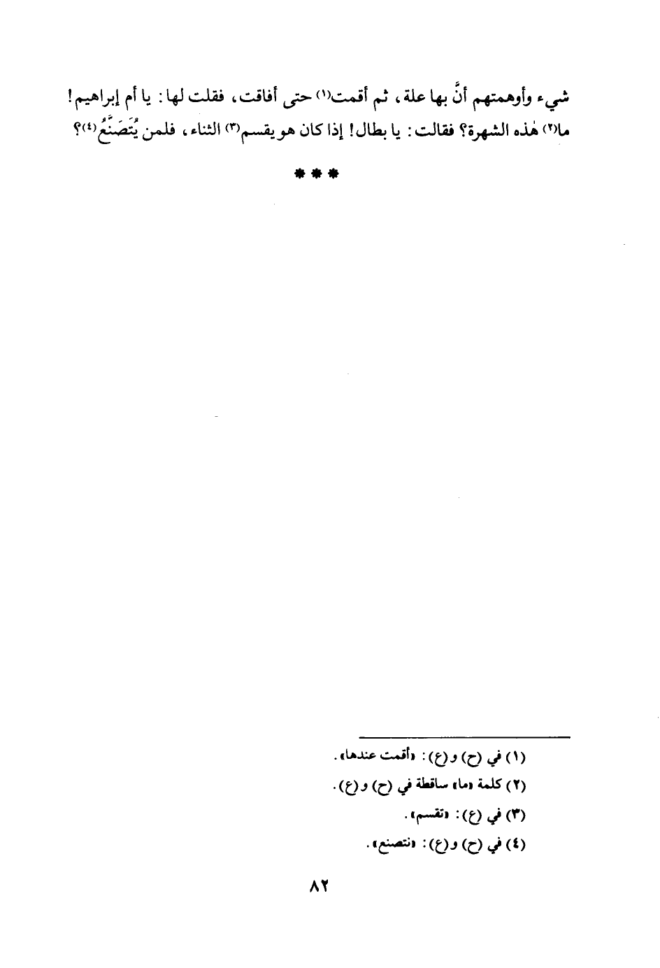 شَيْءٌ وَأَوْهَمْتُهُمْ أَنَّ بِهَا عِلَّةً، ثُمَّ أَقَمْتُ حَتَّى أَفَاقَتْ، فَقُلْتُ لَهَا: يَا أُمَّ إِبْرَاهِيمَ! مَا هَذِهِ الشُّهْرَةُ؟ فَقَالَتْ: يَا بَطَّالُ! إِذَا كان هو يقسم الثناء، فلمن يتصنع؟