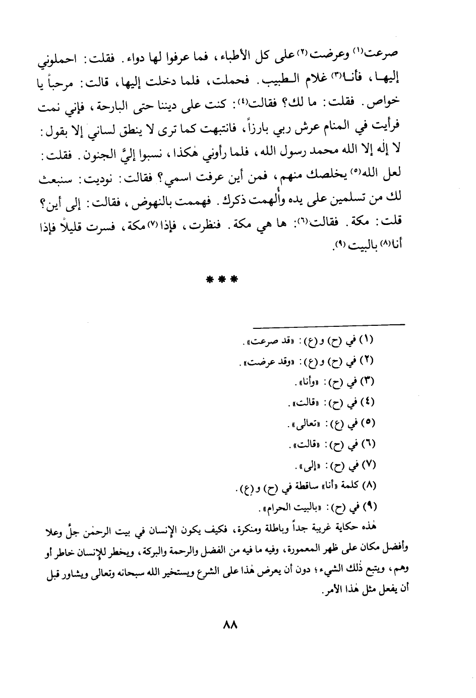 صرعت وعرضت عَلَى كُلِّ الأَطِبَاءِ، فَمَا عَرَفُوا لَهَا دَوَاءً. فقلت: احملوني إِلَيْهَا، فَأَنَا غُلامُ الطَّبِيبِ. فَحُمِلْتُ، فَلَمَّا دَخَلْتُ إِلَيْهَا، قَالَتْ: مَرْحَبًا يَا خَوَّاصُ. فَقُلْتُ: مَا لَكِ؟ فَقَالَتْ: كُنْتُ عَلَى دِينِنَا حَتَّى الْبَارِحَةِ، فإني نمت فرأيت في المنام عَرْشَ رَبِّي بَارِزًا، فَانْتَبَهْتُ كَمَا تَرَى لا ينطق لِسَانِي إِلا بِقَوْلِ: لا إِلَهَ إِلا اللَّهُ محمد رسول الله، فلما رأوني هكذا، نسبوا إِلَى الْجُنُونِ. فَقُلْتُ: لَعَلَّ اللَّهَ يُخُلِّصُكِ مِنْهُمْ، فمن أين عرفت اسمي؟ فقالت: نوديت: سنبعث لك من تسلمين على يده وَأُلْهِمْتُ ذِكْرَكَ. فَهَمَمْتُ بِالنُّهُوضِ، فَقَالَتْ: إِلَى أَيْنَ؟ قلت: مَكَّةَ. فَقَالَتْ: هَا هِيَ مَكَّةُ. فَنَظَرْتُ، فَإِذَا مَكَّةَ، فَسِرْتُ قَلِيلا فَإِذَا أَنَا بِالْبَيْتِ.