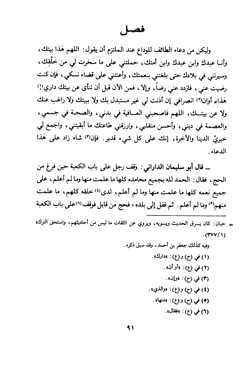 - قَالَ أَبُو سُلَيْمَانَ الدَّارَانِيُّ: وَقَفَ رَجُلٌ عَلَى بَابِ الْكَعْبَةِ حِينَ فَرَغَ مِنَ الْحَجِّ، فَقَالَ: الْحَمْدُ للَّهِ بِجَمِيعِ مَحَامِدِهِ كُلِّهَا مَا عَلِمْتُ مِنْهَا وَمَا لَمْ أَعْلَمْ، عَلَى جَمِيعِ نِعَمِهِ كُلِّهَا مَا علمت منها وما لم أعلم، لدى خَلْقِهِ كُلِّهِمْ، مَا عَلِمْتُ مِنْهُمْ وَمَا لَمْ أعلم. ثم قفل إلى بلد، فَحَجَّ مِنْ قَابِلٍ فَوَقَفَ عَلَى بَابِ الْكَعْبَةِ