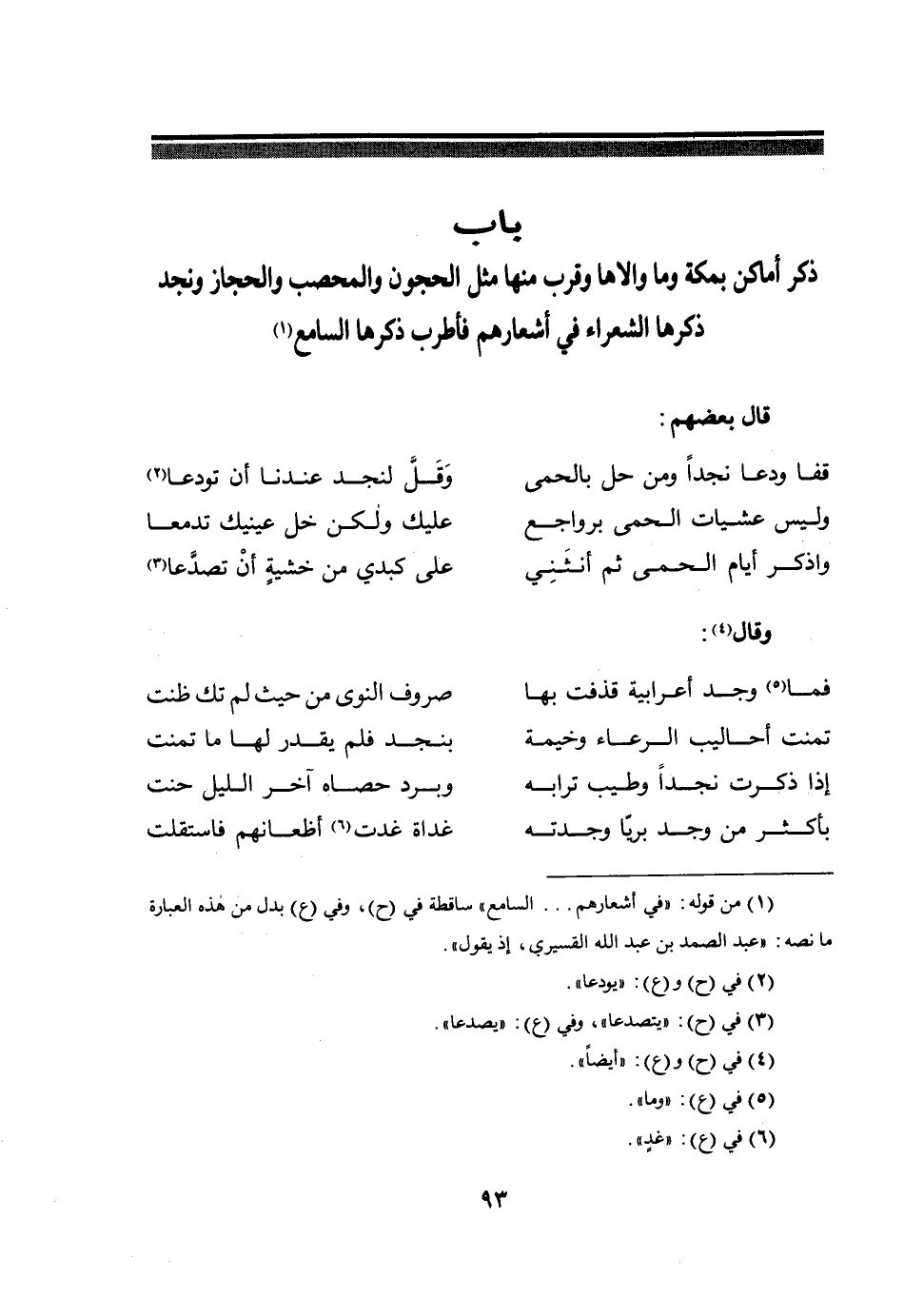 بَابُ ذِكْرِ أَمَاكِنَ بِمَكَّةَ وَمَا وَالاهَا وَقَرُبَ مِنْهَا مِثْلُ الْحَجُونِ وَالْمُحَصَّبِ وَالْحِجَازِ وَنَجْدَ ذَكَرَهَا الشُّعَرَاءُ فِي أَشْعَارِهِمْ فَأَطْرَبَ ذِكْرُهَا السَّامِعَ