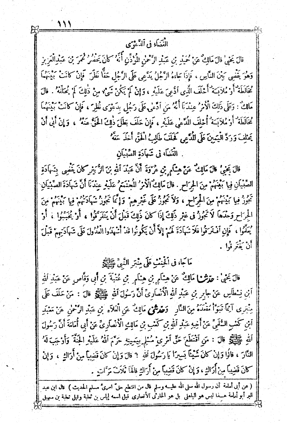[1401] أَلا أخْبركُم بِخَير الشُّهَدَاء الَّذِي يَأْتِي بِشَهَادَتِهِ قبل أَن يسْأَلهَا قَالَ النَّوَوِيّ فِيهِ تَأْوِيلَانِ أصَحهمَا أَنه مَحْمُول على من عِنْده شَهَادَة لإِنْسَان بِحَق وَلَا يعلم ذَلِك الْإِنْسَان أَنه شَاهد فَيَأْتِي إِلَيْهِ فيخبره بِأَنَّهُ شَاهد لَهُ وَالثَّانِي أَنه مَحْمُول على شَهَادَة الْحِسْبَة فِي غير حُقُوق الْآدَمِيّين المختصة بهم فَمن علم شَيْئا من هَذَا النَّوْع وَجب عَلَيْهِ رَفعه إِلَى القَاضِي وإعلامه بِهِ وَالشَّهَادَة وَكَذَا فِي النَّوْع الأول يلْزم من عِنْده شَهَادَة لإِنْسَان لَا يعلمهَا أَن يُعلمهُ إِيَّاهَا لِأَنَّهَا أَمَانَة عِنْده وَحكى تَأْوِيل ثَالِث أَنه مَحْمُول على الْمجَاز وَالْمُبَالغَة فِي أَدَاء الشَّهَادَة بعد طلبَهَا لَا قبله كَمَا يُقَال الْجواد يعْطى قبل السُّؤَال أَي يُعْطي سَرِيعا عب السُّؤَال من غير توقف قَالَ الْعلمَاء وَلَيْسَ فِي هَذَا الحَدِيث مناقضة للْحَدِيث الآخر فِي ذمّ من يَأْتِي بِالشَّهَادَةِ قبل أَن يستشهد فِي قَوْله صلى الله عَلَيْهِ وَسلم يشْهدُونَ وَلَا يستشهدون وَقد تَأَول الْعلمَاء هَذَا تأويلات أَصَحهَا أَنه مَحْمُول على من مَعَه شَهَادَة لآدَمِيّ عَالم بهَا فَيَأْتِي فَيشْهد وَلم يستشهد وَالثَّانِي أَنه مَحْمُول على من ينْتَصب شَاهدا وَلَيْسَ هُوَ من أهل الشَّهَادَة وَالثَّالِث أَنه مَحْمُول على من يشْهد لقوم بِالْجنَّةِ أَو بالنَّار من غير تَوْقِيف وَهَذَا ضَعِيف انْتهى عَن جَعْفَر بن مُحَمَّد عَن أَبِيه أَن رَسُول الله صلى الله عَلَيْهِ وَسلم قضى بِالْيَمِينِ مَعَ الشَّاهِد قَالَ بن عبد الْبر رَوَاهُ عَن مَالك جمَاعَة فوصلوه عَن جَابر مِنْهُم عُثْمَان بن خَالِد العثماني وَإِسْمَاعِيل بن مُوسَى الْكُوفِي وَرَوَاهُ عَن مَالك أَيْضا مُحَمَّد بن عبد الرَّحْمَن بن رداد ومسكين بن بكير فوصلاه عَن عَليّ وَقد أسْندهُ عَن جَعْفَر بن مُحَمَّد عَن أَبِيه عَن جَابر جمَاعَة حفاظ مِنْهُم عبيد الله بن عمر وَعبد الْوَهَّاب الثَّقَفِيّ وَمُحَمّد بن عبد الرَّحْمَن بن رداد وَيحيى بن سليم وَإِبْرَاهِيم بن أبي حَيَّة قلت أخرجه التِّرْمِذِيّ وَابْن ماجة من طَرِيق عبد الْوَهَّاب بِهِ