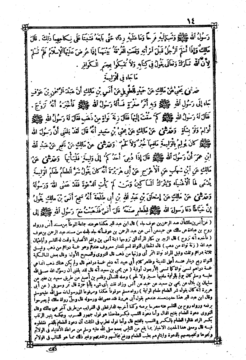 [1135] عَن أنس بن مَالك أَن عبد الرَّحْمَن بن عَوْف جَاءَ قَالَ بن عبد الْبر هَكَذَا هُوَ عِنْد جمَاعَة الْمُوَطَّأ ن مُسْند أنس وَرَوَاهُ روح بن عبَادَة عَن مَالك عَن حميد عَن أنس عَن عبد الرَّحْمَن بن عَوْف أَنه جَاءَ فَجعله من مُسْند عبد الرَّحْمَن بن عَوْف فَأخْبرهُ أَنه تزوج قَالَ الزبير بن بكار الْمَرْأَة الَّتِي تزَوجهَا ابْنة أنس بن رَافع الْأَنْصَارِيَّة ولدت لَهُ الْقَاسِم وَأَبا عُثْمَان عبد الله زنة نواة من ذهب قَالَ الْخطابِيّ النواة اسْم لمقدار مَعْرُوف عِنْدهم وَهُوَ خَمْسَة دَرَاهِم من ذهب وَقيل ثَلَاثَة دَرَاهِم وَثلث وَقيل المُرَاد نواة التَّمْر أَي وَزنهَا من ذهب قَالَ النَّوَوِيّ وَالصَّحِيح الأول وَقَالَ بعض الْمَالِكِيَّة النواة ربع دِينَار عِنْد أهل الْمَدِينَة وَظَاهر كَلَام أبي عبيد أَنه دفع خَمْسَة دَرَاهِم قَالَ وَلم يكن هُنَاكَ ذهب إِنَّمَا هِيَ خَمْسَة دَرَاهِم تسمى نواة كَمَا تسمى الْأَرْبَعُونَ أُوقِيَّة