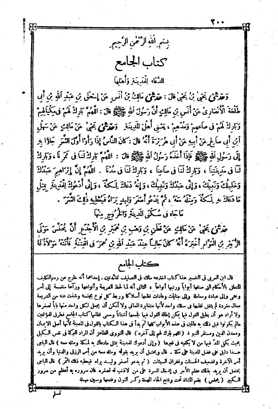 قَالَ ابْن الْعَرَبِيّ فِي التَّفْسِير: هَذَا كتاب اخترعه مَالك فِي التصنيف لفائدتين إِحْدَاهمَا أَنه خَارج عَن رسم التَّكْلِيف الْمُتَعَلّق بِالْأَحْكَامِ الَّتِي صنفها أبوابا ورتبها أنواعا الثَّانِي أَنه لما لحظ الشَّرِيعَة وأنواعها وَرَآهَا منقسمة إِلَى أَمر وَنهي وَإِلَى عبَادَة ومعاملة وَإِلَى جنايات وعادات نظمها أسلاكا وربط كل نوع بِجِنْسِهِ وشذت عَنهُ من الشَّرِيعَة معَان مُفْردَة لم يتَّفق نظمها فِي سلك وَاحِد لِأَنَّهَا مُتَغَايِرَة الْمعَانِي وَلَا أمكن أَن يَجْعَل لكل وَاحِد مِنْهَا بَابا لصغرها وَلَا أَرَادَ هُوَ أَن يُطِيل القَوْل فِيمَا يُمكن إطالة القَوْل فِيهَا فجمعها أشتاتا وسمى نظامها كتاب الْجَامِع فطرق للمؤلفين مَا لم يَكُونُوا قبل ذَلِك بِهِ عَالمين فِي هَذِه الْأَبْوَاب كلهَا ثمَّ بَدَأَ فِي هَذَا الْكتاب بالْقَوْل فِي الْمَدِينَة لِأَنَّهَا أصل الْإِيمَان ومعدن الدّين ومستقر النُّبُوَّة