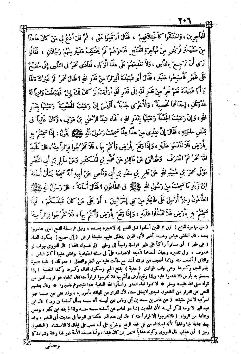 [1587] بسرغ بِفَتْح السِّين الْمُهْملَة ثمَّ رَاء سَاكِنة فِي الْمَشْهُور ثمَّ غين مُعْجمَة مَصْرُوف وممنوع قَرْيَة فِي طرف الشَّام مِمَّا يَلِي الْحجاز أُمَرَاء الأجناد هِيَ مدن الشَّام الْخمس وَهِي فلسطين والأردن ودمشق وحمص وقنسرين الوباء مَهْمُوز وقصره أفْصح من مده ادْع لي الْمُهَاجِرين الْأَوَّلين هم من صلى إِلَى الْقبْلَتَيْنِ من مهاجرة الْفَتْح قيل هم الَّذين أَسْلمُوا قبل افْتَحْ إِذْ لَا هِجْرَة بعده وَقيل هم مسلمة الْفَتْح الَّذين هَاجرُوا بعده قَالَ القَاضِي عِيَاض وَهَذَا أظهر لأَنهم الَّذين ينْطَلق عَلَيْهِم مشيخة إِنِّي مصبح بِسُكُون الصَّاد على ظهر أَي مُسَافِرًا رَاكِبًا على ظهر الرَّاحِلَة رَاجعا إِلَى وطني لَو غَيْرك قَالَهَا قَالَ النوي جَوَاب لَو مَحْذُوف وَفِي تَقْدِيره وَجْهَان أَحدهمَا لأدبته لإعراضه عَليّ فِي مَسْأَلَة اجتهادية وَافقنِي عَلَيْهَا أَكثر النَّاس وَالثَّانِي لم أتعجب مِنْهُ وَإِنَّمَا أتعجب من قَوْلك أَنْت مَعَ مَا أَنْت عَلَيْهِ من الْعلم وَالْفضل عدوتان تَثْنِيَة عدوة بِضَم الْعين وَكسرهَا وَهِي جَانب الْوَادي جدبة بِفَتْح الْجِيم وَسُكُون الدَّال وَكسرهَا وَكَذَا الخصبة إِذا سَمِعْتُمْ بِهِ بِأَرْض فَلَا تقدمُوا عَلَيْهِ وَإِذا وَقع بِأَرْض وَأَنْتُم بهَا فَلَا تخْرجُوا فِرَارًا مِنْهُ قَالَ الْعلمَاء هُوَ قريب الْمَعْنى من قَوْله صلى الله عَلَيْهِ وَسلم لَا تَتَمَنَّوْا لِقَاء الْعَدو واسألوا الله الْعَافِيَة فَإِذا لقيتموهم فَاصْبِرُوا قَالَ بَعضهم النَّهْي عَن الْفِرَار من الطَّاعُون تعبدي لَا يعقل مَعْنَاهُ لِأَن الْفِرَار من المهالك مَأْمُور بِهِ وَقد نهي عَن هَذَا فَهُوَ لسر فِيهِ لَا نعلم حَقِيقَته