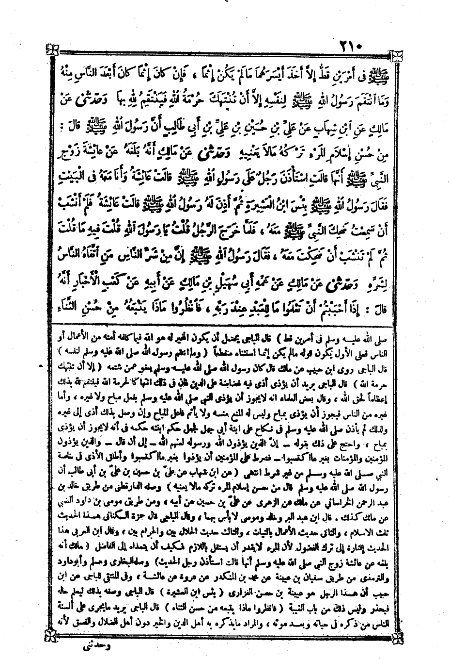 [1604] عَن بن شهَاب عَن عَليّ بن حُسَيْن بن عَليّ بن أبي طَالب أَن رَسُول الله صلى الله عَلَيْهِ وَسلم قَالَ من حسن إِسْلَام الْمَرْء تَركه مَالا يعنيه وَصله الدَّارَقُطْنِيّ من طَرِيق خَالِد بن عبد الرَّحْمَن الْخُرَاسَانِي عَن مَالك عَن الزُّهْرِيّ عَن عَليّ بن حُسَيْن عَن أَبِيه وَمن طَرِيق مُوسَى بن دَاوُد الضَّبِّيّ عَن مَالك كَذَلِك قَالَ بن عبد الْبر وخَالِد ومُوسَى لَا بَأْس بهما وَقَالَ الْبَاجِيّ قَالَ حَمْزَة الْكِنَانِي هَذَا الحَدِيث ثلث الْإِسْلَام وَالثَّانِي حَدِيث الْأَعْمَال بِالنِّيَّاتِ وَالثَّالِث حَدِيث الْحَلَال بَين وَالْحرَام بَين وَقَالَ بن الْعَرَبِيّ هَذَا الحَدِيث إِشَارَة إِلَى ترك الفضول لِأَن الْمَرْء لَا يقدر أَن يسْتَقلّ باللازم فَكيف أَن يتعداه إِلَى الْفَاضِل