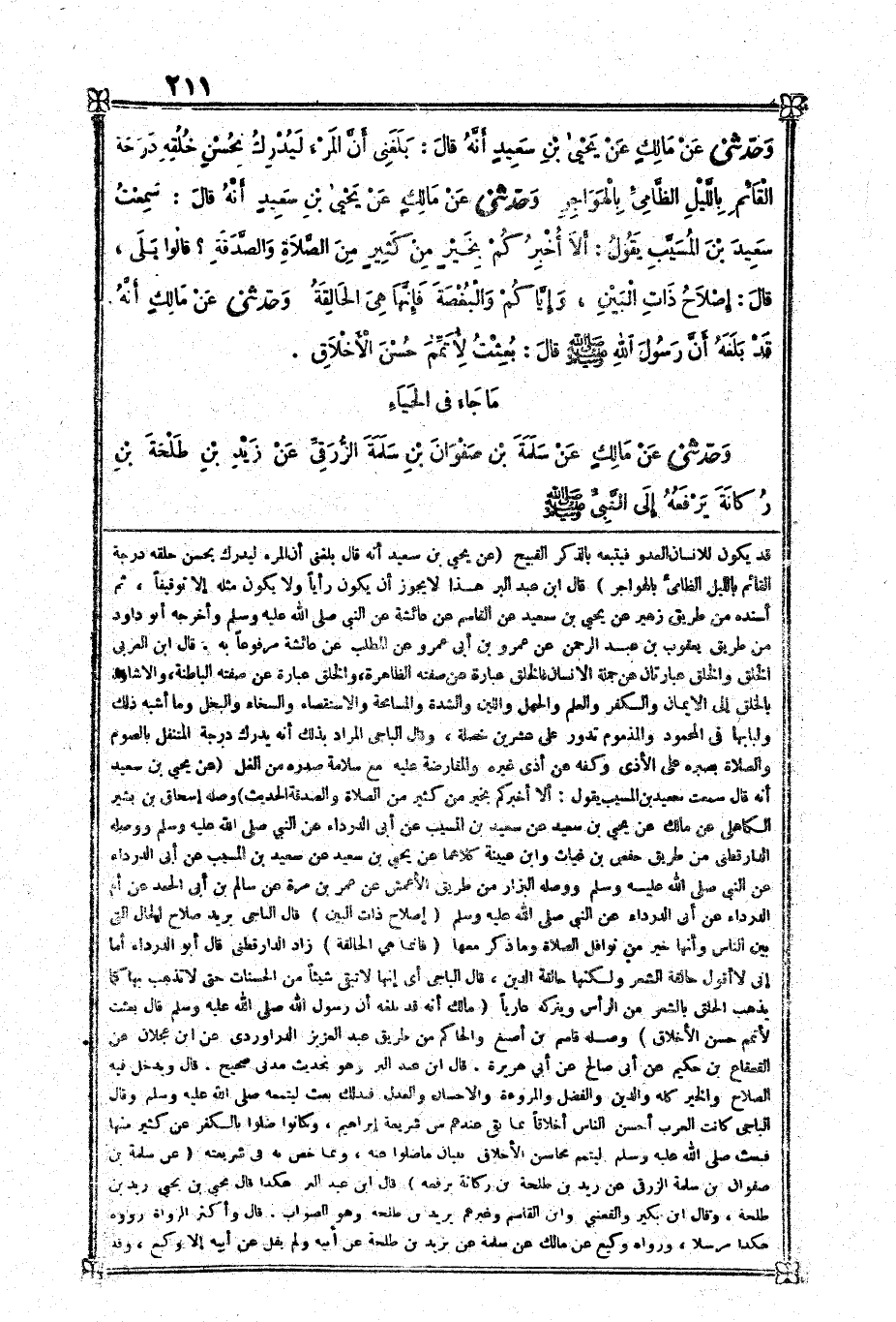 [1609] مَالك أَنه قد بلغه أَن رَسُول الله صلى الله عَلَيْهِ وَسلم قَالَ بعثت لأتمم حسن الْأَخْلَاق وَصله قَاسم بن أَسْبغ وَالْحَاكِم من طَرِيق عبد الْعَزِيز الدَّرَاورْدِي عَن بن عجلَان عَن الْقَعْقَاع بن حَكِيم عَن أبي صَالح عَن أبي هُرَيْرَة قَالَ بن عبد الْبر وَهُوَ بِحَدِيث مدنِي صَحِيح قَالَ وَيدخل فِيهِ الصّلاح وَالْخَيْر كُله وَالدّين وَالْفضل والمروءة وَالْإِحْسَان وَالْعدْل فبذلك بعث ليتممه صلى الله عَلَيْهِ وَسلم وَقَالَ الْبَاجِيّ كَانَت الْعَرَب أحسن النَّاس أَخْلَاقًا بِمَا بَقِي عِنْدهم من شَرِيعَة إِبْرَاهِيم وَكَانُوا ضلوا بالْكفْر عَن كثير مِنْهَا فَبعث صلى الله عَلَيْهِ وَسلم ليتمم محَاسِن الْأَخْلَاق بِبَيَان مَا ضلوا عَنهُ وَبِمَا خص بِهِ فِي شَرِيعَته