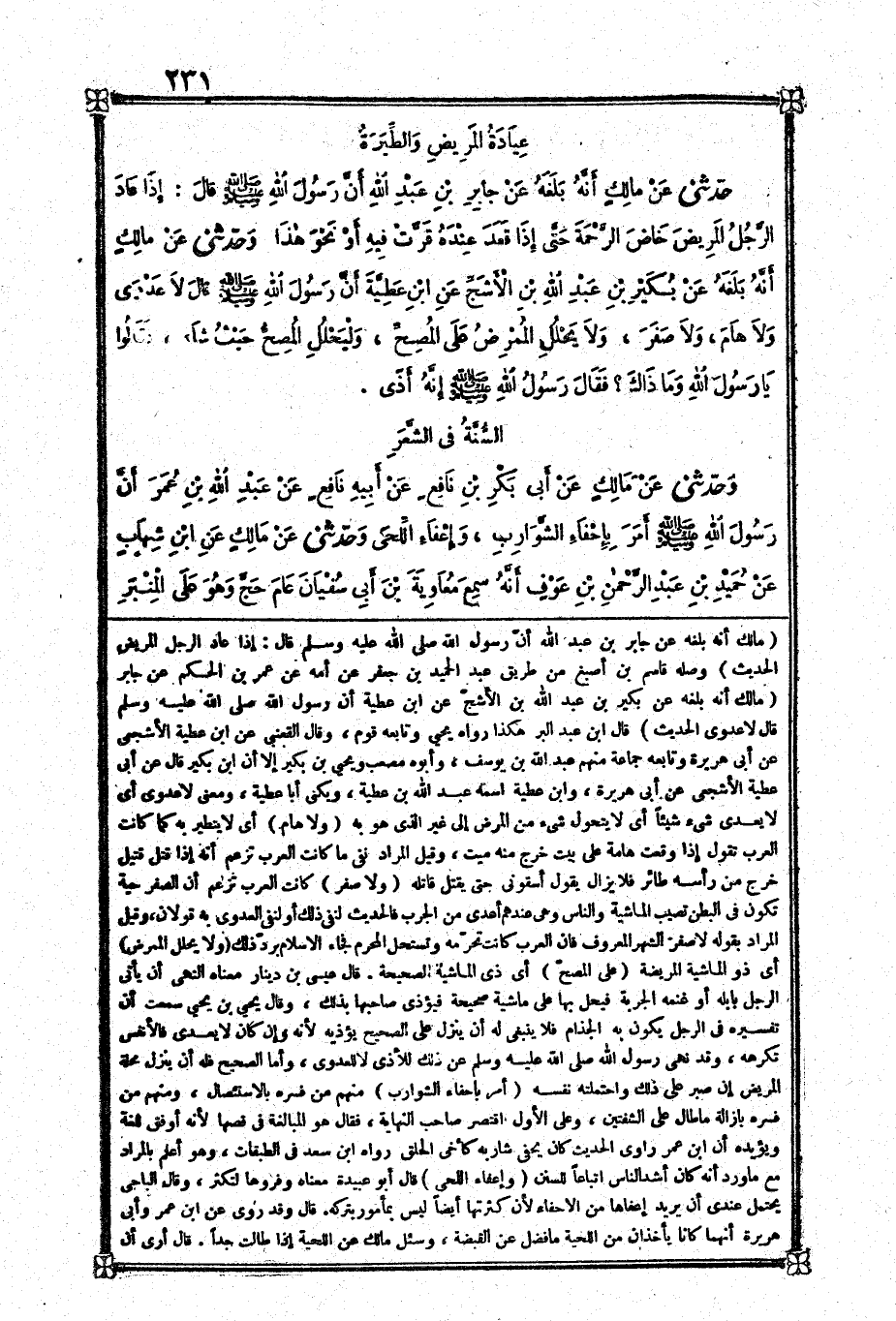 [1695] مَالك أَنه بلغه عَن بكير بن عبد الله بن الْأَشَج عَن بن عَطِيَّة أَن رَسُول الله صلى الله عَلَيْهِ وَسلم قَالَ لَا عدوى الحَدِيث قَالَ بن عبد الْبر هَكَذَا رَوَاهُ يحيى وَتَابعه قوم وَقَالَ القعْنبِي عَن بن عَطِيَّة الْأَشْجَعِيّ عَن أبي هُرَيْرَة وَتَابعه جمَاعَة مِنْهُم عبد الله بن يُوسُف وَأَبوهُ مُصعب وَيحيى بن بكير إِلَّا أَن بن بكير قَالَ عَن أبي عَطِيَّة الْأَشْجَعِيّ عَن أبي هُرَيْرَة وَابْن عَطِيَّة اسْمه عبد الله بن عَطِيَّة ويكنى أَبَا عَطِيَّة وَمعنى لَا عدوى أَي لَا يعدى شَيْء شَيْئا أَي لَا يتَحَوَّل شَيْء من الْمَرَض إِلَى غير الَّذِي هُوَ بِهِ وَلَا هام أَي لَا يتطير بِهِ كَمَا كَانَت الْعَرَب تَقول إِذا وَقعت هَامة على بَيت خرج مِنْهُ ميت وَقيل المُرَاد نفي مَا كَانَت الْعَرَب تزْعم أَنه إِذا قتل قَتِيل خرج من رَأسه طَائِر فَلَا يزَال يَقُول أسقوني حَتَّى يقتل قَاتله وَلَا صفر كَانَت الْعَرَب تزْعم أَن الصفر حَيَّة تكون فِي الْبَطن تصيب الْمَاشِيَة وَالنَّاس وَهِي عِنْدهم أعدى من الجرب فَالْحَدِيث لنفي ذَلِك أَو لنفي الْعَدْوى بِهِ قَولَانِ وَقيل المُرَاد بقوله لَا صفر الشَّهْر الْمَعْرُوف فَإِن الْعَرَب كَانَت تحرمه وتستحل الْمحرم فجَاء الْإِسْلَام برد ذَلِك وَلَا يحل الممرض أَي ذُو الْمَاشِيَة الْمَرِيضَة على المصح أَي ذِي الْمَاشِيَة الصَّحِيحَة قَالَ عِيسَى بن دِينَار مَعْنَاهُ النَّهْي أَن يَأْتِي الرجل بإبله أَو غنمه الجربة فَيحل بهَا على مَاشِيَة صَحِيحَة فيؤذى صَاحبهَا بذلك وَقَالَ يحيى بن يحيى سَمِعت أَن تَفْسِيره فِي الرجل يكون بِهِ الجذام فَلَا يَنْبَغِي لَهُ أَن ينزل على الصَّحِيح يُؤْذِيه لِأَنَّهُ وَإِن كَانَ لَا يعدى فالأنفس تكرههُ وَقد نهى رَسُول الله صلى الله عَلَيْهِ وَسلم عَن ذَلِك للأذى لَا للعدوى وَأما الصَّحِيح فَلهُ أَن ينزل محلّة الْمَرِيض إِن صَبر على ذَلِك واحتملته نَفسه