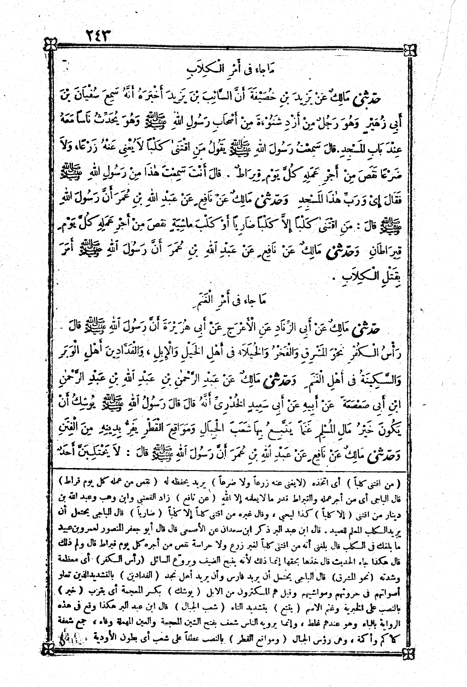 [1741] عَن نَافِع زَاد القعْنبِي وَابْن وهب وَعبد الله بن دِينَار من اقتنى إِلَّا كَلْبا كَذَا ليحيى وَقَالَ غَيره من اقتنى كَلْبا إِلَّا كَلْبا ضاريا قَالَ الْبَاجِيّ يحْتَمل أَن يُرِيد الْكَلْب الْمعلم للصَّيْد قَالَ بن عبد الْبر ذكر بن سَعْدَان عَن الْأَصْمَعِي قَالَ قَالَ أَبُو جَعْفَر الْمَنْصُور لعَمْرو بن عبيد مَا بلغك فِي الْكَلْب قَالَ بَلغنِي أَنه من اتنى كَلْبا لغير زرع وَلَا حراسة نقص من أجره كل يَوْم قِيرَاط قَالَ وَلم ذَلِك قَالَ هَكَذَا جَاءَ الحَدِيث قَالَ خُذْهَا بِحَقِّهَا إِنَّمَا ذَلِك لِأَنَّهُ ينبح الضَّيْف ويروع السَّائِل