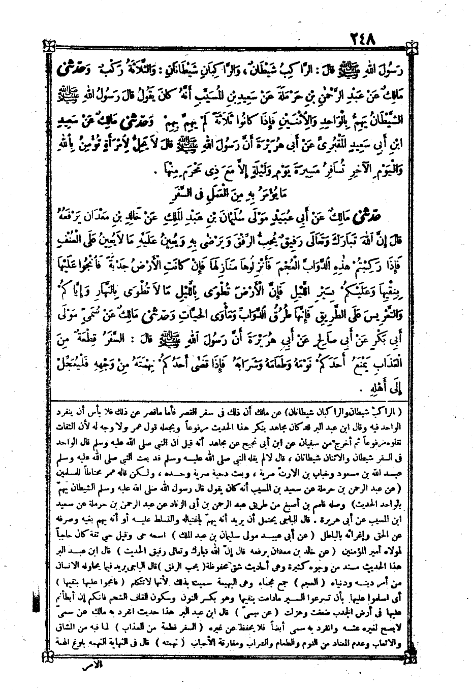 [1765] عَن عبد الرَّحْمَن بن حَرْمَلَة عَن سعيد بن الْمسيب أَنه كَانَ يَقُول قَالَ رَسُول الله صلى الله عَلَيْهِ وَسلم الشَّيْطَان يهم بِالْوَاحِدِ الحَدِيث وَصله قَاسم بن أصبغ من طَرِيق عبد الرَّحْمَن بن أبي الزِّنَاد عَن عبد الرَّحْمَن بن حَرْمَلَة عَن سعيد بن الْمسيب عَن أبي هُرَيْرَة قَالَ الْبَاجِيّ يحْتَمل أَن يُرِيد أَنه يهم باغتياله والتسلط لعيه أَو أَنه يهم بغيه وَصَرفه عَن الْحق وإغرائه بِالْبَاطِلِ