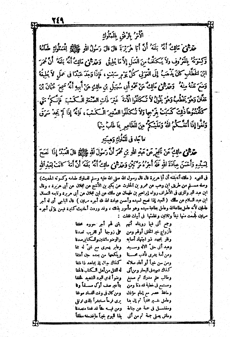 [1769] مَالك أَنه بلغه أَن أَبَا هُرَيْرَة قَالَ قَالَ رَسُول الله صلى الله عَلَيْهِ وَسلم للمملوك طَعَامه وَكسوته الحَدِيث وَصله مُسلم من طَرِيق بن وهب عَن عَمْرو بن الْحَارِث عَن بكير بن الْأَشَج عَن عجلَان عَن أبي هُرَيْرَة وَقَالَ بن عبد الْبر والمزي فِي الْأَطْرَاف رَوَاهُ إِبْرَاهِيم بن طهْمَان عَن مَالك عَن بن عجلَان عَن أبي هُرَيْرَة وَتَابعه النُّعْمَان بن عبد السَّلَام عَن مَالك