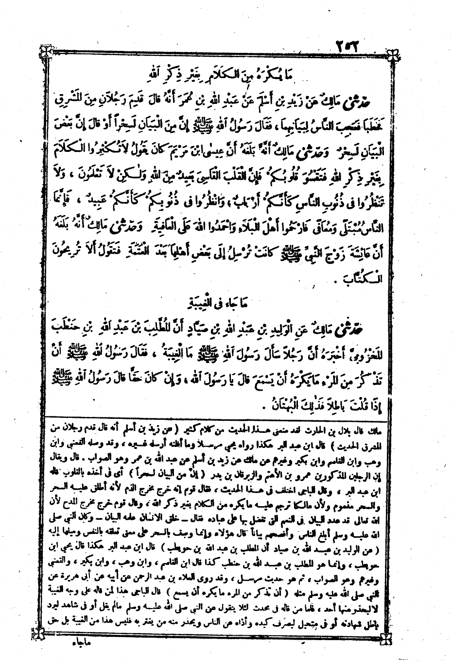 [1783] عَن زيد بن أسلم أَنه قَالَ قدم رجلَانِ من الْمشرق الحَدِيث قَالَ بن عبد الْبر هَكَذَا رَوَاهُ يحيى مُرْسلا وَمَا أَظُنهُ أرْسلهُ غَيره وَقد وَصله القعْنبِي وَابْن وهب وَابْن الْقَاسِم وَابْن بكير وَغَيرهم عَن مَالك عَن زيد بن أسلم عَن عبد الله بن عمر وَهُوَ الصَّوَاب قَالَ وَيُقَال إِن الرجلَيْن الْمَذْكُورين عَمْرو بن الْأَهْتَم والزبرقان بن بدر إِن من الْبَيَان لسحرا أَي فِي أَخذه بالقلوب قَالَه بن عبد الْبر وَقَالَ الْبَاجِيّ اخْتلف فِي هَذَا الحَدِيث فَقَالَ قوم إِنَّه خرج مخرج الذَّم لِأَنَّهُ أطلق عَلَيْهِ السحر وَالسحر مَذْمُوم وَلِأَن مَالِكًا ترْجم عَلَيْهِ مَا يكره من الْكَلَام بِغَيْر ذكر الله وَقَالَ قوم خرج مخرج الْمَدْح لِأَن الله تَعَالَى قد عدد الْبَيَان فِي النعم الَّتِي تفضل بهَا على عباده فَقَالَ خَلَقَ الْأِنْسَانَ عَلَّمَهُ الْبَيَانَ وَكَانَ النَّبِي صلى الله عَلَيْهِ وَسلم أبلغ النَّاس وأفصحهم بَيَانا قَالَ هَؤُلَاءِ وَإِنَّمَا وصف بِالسحرِ على معنى تعلقه بِالنَّفسِ وميلها إِلَيْهِ