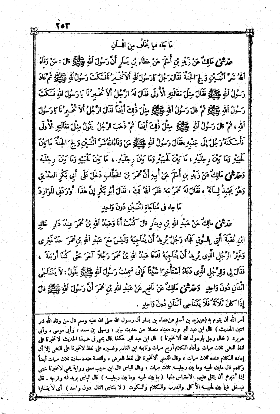 [1787] عَن زيد بن اسْلَمْ عَن عَطاء بن يسَار أَن رَسُول الله صلى الله عَلَيْهِ وَسلم قَالَ من وَقَاه الله شَرّ اثْنَيْنِ الحَدِيث قَالَ بن عبد الْبر ورد مَعْنَاهُ مُتَّصِلا من حَدِيث جَابر وَسَهل بن سعد وَأبي مُوسَى وَأبي هُرَيْرَة فَقَالَ رجل يَا رَسُول الله إِلَّا تخبرنا قَالَ بن عبد الْبر هَكَذَا قَالَ يحيى فِي هَذَا الحَدِيث لَا تخبرنا على لفظ النَّهْي ثَلَاث مَرَّات وَأعَاد الْكَلَام أَربع مَرَّات وَتَابعه بن الْقَاسِم وَغَيره على لفظ لَا تخبرنا على النَّهْي إِلَّا أَن إادة الْكَلَام عِنْده ثَلَاث مَرَّات وَقَالَ القعْنبِي إِلَّا تخبرنا على لفظ الْعرض والقصة عِنْده معادة ثَلَاث مَرَّات أَيْضا وَكلهمْ قَالَ مَا بَين لحييْهِ وَمَا بَين رجلَيْهِ ثَلَاث مَرَّات وَقَالَ الْبَاجِيّ قَالَ بن حبيب معنى رِوَايَة يحيى لَا تخبرنا خشِي إِذا أخْبرهُم أَن يثقل عَلَيْهِم الاحتراس مِنْهَا مَا بَين لحييْهِ وَمَا بَين رجلَيْهِ قَالَ الْبَاجِيّ يُرِيد فَمه وفرجه قَالَ فَيدْخل فِيمَا بَين لحييْهِ الْأكل وَالشرب وَالْكَلَام وَالسُّكُوت