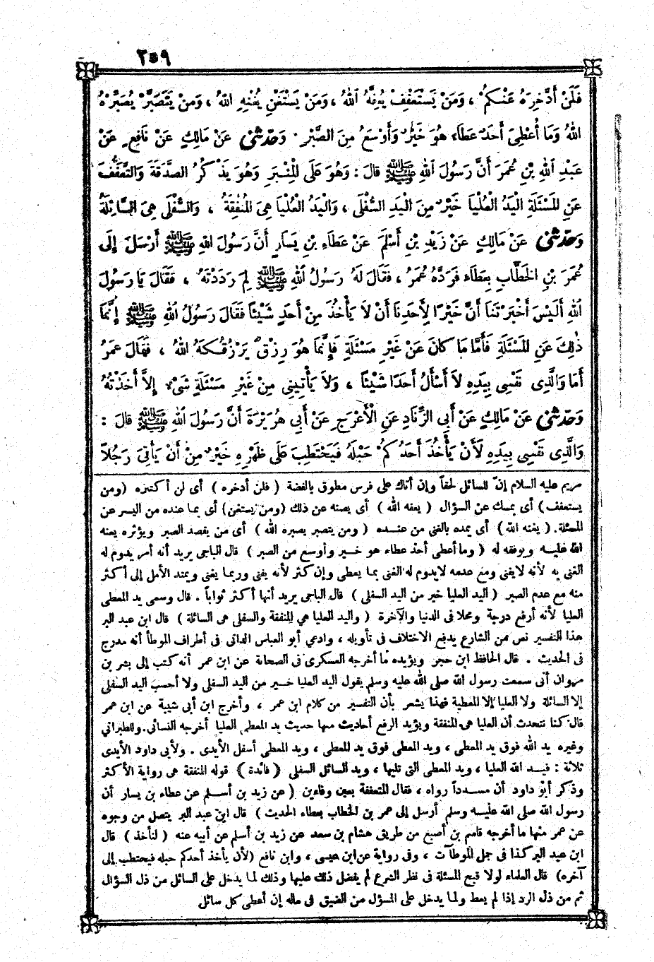 [1813] الْيَد الْعليا خير من الْيَد السُّفْلى قَالَ الْبَاجِيّ يُرِيد أَنَّهَا أَكثر ثَوابًا قَالَ وسمى يَد الْمُعْطِي الْعليا لِأَنَّهُ أرفع دَرَجَة ومحلا فِي الدُّنْيَا وَالْآخِرَة وَالْيَد الْعليا هِيَ المنفقة والسفلى هِيَ السائلة قَالَ بن عبد الْبر هَذَا التَّفْسِير نَص من الشَّارِع يدْفع الِاخْتِلَاف فِي تَأْوِيله وَادّعى أَبُو الْعَبَّاس الداني فِي أَطْرَاف الْمُوَطَّأ أَنه مدرج فِي الحَدِيث قَالَ الْحَافِظ بن حجر وَيُؤَيِّدهُ مَا أخرجه العسكري فِي الصَّحَابَة عَن بن عمر أَنه كتب إِلَى بشر بن مَرْوَان أَنِّي سَمِعت رَسُول الله صلى الله عَلَيْهِ وَسلم يَقُول الْيَد الْعليا خير من الْيَد السُّفْلى وَلَا أَحسب الْيَد السُّفْلى إِلَّا السائلة وَلَا الْعليا إِلَّا المعطية فَهَذَا يشْعر بِأَن التَّفْسِير من كَلَام بن عمر وَأخرج بن أبي شيبَة عَن بن عمر قَالَ كُنَّا نتحدث أَن الْعلي هِيَ المنفقة وَيُؤَيّد الرّفْع أَحَادِيث مِنْهَا حَدِيث يَد الْمُعْطِي الْعليا أخرجه النَّسَائِيّ وللطبراني وَغَيره يَد الله فَوق يَد الْمُعْطِي وَيَد الْمُعْطِي فَوق يَد الْمُعْطِي وَيَد الْمُعْطِي أَسْفَل الْأَيْدِي وَلأبي دَاوُد الْأَيْدِي ثَلَاثَة فيد الله الْعليا وَيَد الْمُعْطِي الَّتِي تَلِيهَا وَيَد السَّائِل السُّفْلى فَائِدَة قَوْله المنفقة هِيَ رِوَايَة الْأَكْثَر وَذكر أَبُو دَاوُد أَن مُسَددًا رَوَاهُ فَقَالَ المتعففة بِعَين وفاءين