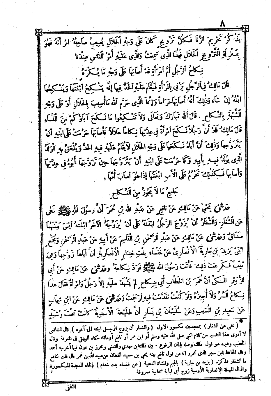 [1112] نهى عَن الشّغَار بمعجمتين مكسور الأول والشغار أَن يُزَوّج الرجل ابْنَته إِلَى آخِره قَالَ الشَّافِعِي لَا أَدْرِي هَذَا التَّفْسِير من كَلَام النَّبِي صلى الله عَلَيْهِ وَسلم أَو بن عمر أَو نَافِع أَو مَالك حَكَاهُ الْبَيْهَقِيّ فِي الْمعرفَة وَقَالَ الْخَطِيب وَغَيره هُوَ قَول مَالك وَصله بِالْمَتْنِ الْمَرْفُوع بَين ذَلِك بن مهْدي والقعنبي ومحرز بن عون فِيمَا أخرجه أَحْمد وَقَالَ الْحَافِظ بن حجر الَّذِي تحرر أَنه من قَول نَافِع بَينه يحيى بن سعيد الْقطَّان عَن عبيد الله بن عمر قَالَ قلت لنافع مَا الشّغَار فَذكره