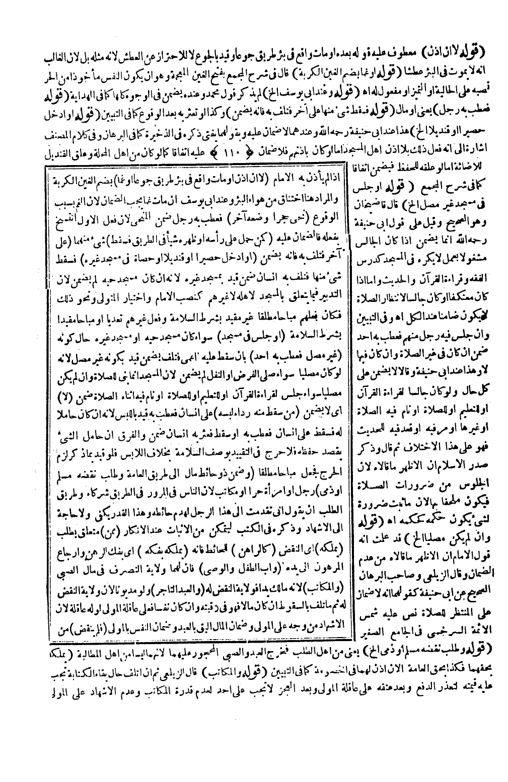 وَفِي التَّبْيِينِ وَإِنْ جَلَسَ فِيهِ رَجُلٌ مِنْهُمْ فَعَطِبَ بِهِ أَحَدٌ ضَمِنَ إنْ كَانَ فِي غَيْرِ الصَّلَاةِ وَإِنْ كَانَ فِيهَا لَا وَهَذَا عِنْدَ أَبِي حَنِيفَةَ وَقَالَا لَا يَضْمَنُ عَلَى كُلِّ حَالٍ وَلَوْ كَانَ جَالِسًا لِقِرَاءَةِ الْقُرْآنِ أَوْ لِلتَّعْلِيمِ أَوْ لِلصَّلَاةِ أَوْ نَامَ فِيهِ فِي الصَّلَاةِ أَوْ غَيْرِهَا أَوْ مَرَّ فِيهِ أَوْ قَعَدَ فِيهِ لِلْحَدِيثِ فَهُوَ عَلَى هَذَا الِاخْتِلَافِ ثُمَّ قَالَ وَذَكَرَ صَدْرُ الْإِسْلَامِ أَنَّ الْأَظْهَرَ مَا قَالَاهُ لِأَنَّ الْجُلُوسَ مِنْ ضَرُورَاتِ الصَّلَاةِ فَيَكُونُ مُلْحَقًا بِهَا لِأَنَّ مَا ثَبَتَ ضَرُورَةً لِشَيْءٍ يَكُونُ حُكْمُهُ كَحُكْمِهِ اهـ.