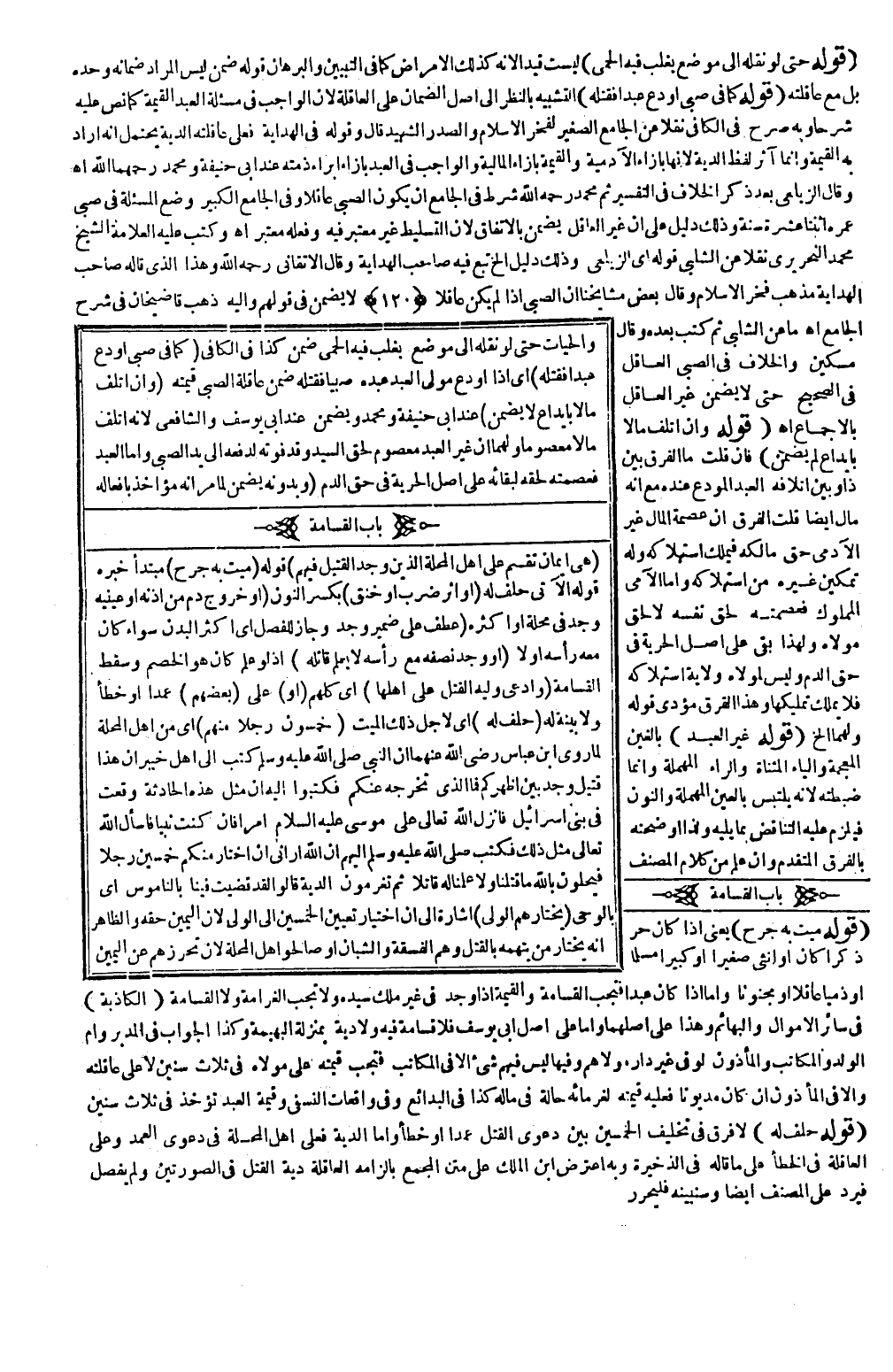 (بَابُ الْقَسَامَةِ) (قَوْلُهُ مَيِّتٌ بِهِ جُرْحٌ) يَعْنِي إذَا كَانَ حُرًّا ذَكَرًا كَانَ أَوْ أُنْثَى صَغِيرًا أَوْ كَبِيرًا مُسْلِمًا أَوْ ذِمِّيًّا عَاقِلًا أَوْ مَجْنُونًا وَأَمَّا إذَا كَانَ عَبْدًا فَتَجِبُ الْقَسَامَةُ وَالْقِيمَةُ إذَا وُجِدَ فِي غَيْرِ مِلْكِ سَيِّدِهِ وَلَا تَجِبُ الْغَرَامَةُ وَلَا الْقَسَامَةُ فِي سَائِرِ الْأَمْوَالِ وَالْبَهَائِمِ وَهَذَا عَلَى أَصْلِهِمَا وَأَمَّا عَلَى أَصْلِ أَبِي يُوسُفَ فَلَا قَسَامَةَ فِيهِ وَلَا دِيَةَ بِمَنْزِلَةِ الْبَهِيمَةِ وَكَذَا الْجَوَابُ فِي الْمُدَبَّرِ وَأُمِّ الْوَلَدِ وَالْمُكَاتَبِ وَالْمَأْذُونِ لَوْ فِي غَيْرِ دَارِ مَوْلَاهُمْ وَفِيهَا لَيْسَ فِيهِمْ شَيْءٌ إلَّا فِي الْمُكَاتَبِ فَتَجِبُ قِيمَتُهُ عَلَى مَوْلَاهُ فِي ثَلَاثِ سِنِينَ لَا عَلَى عَاقِلَتِهِ وَإِلَّا فِي الْمَأْذُونِ إنْ كَانَ مَدْيُونًا فَعَلَيْهِ قِيمَةٌ لِغُرَمَائِهِ حَالَّةٌ فِي مَالِهِ كَذَا فِي الْبَدَائِعِ.