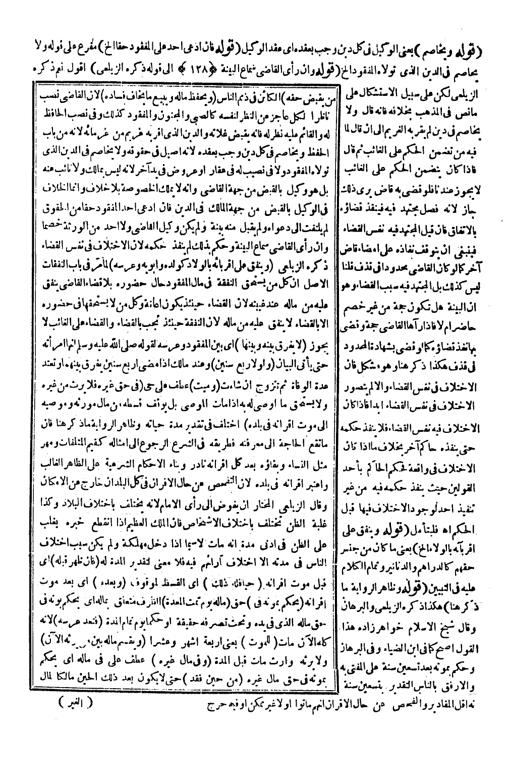 ـــــــــــــــــــــــــــــQقَوْلُهُ وَيُخَاصِمُ) يَعْنِي الْوَكِيلَ فِي كُلِّ دَيْنٍ وَجَبَ بِعَقْدِهِ أَيْ عَقْدِ الْوَكِيلِ (قَوْلُهُ فَإِنْ ادَّعَى أَحَدٌ عَلَى الْمَفْقُودِ حَقًّا. . . إلَخْ) مُفَرَّعٌ عَلَى قَوْلِهِ وَلَا يُخَاصِمُ فِي الدَّيْنِ الَّذِي تَوَلَّاهُ الْمَفْقُودُ. . . إلَخْ (قَوْلُهُ وَإِنْ رَأَى الْقَاضِي سَمَاعَ الْبَيِّنَةِ إلَى قَوْلِهِ ذَكَرَهُ الزَّيْلَعِيُّ) أَقُولُ نَعَمْ ذَكَرَهُ الزَّيْلَعِيُّ لَكِنْ عَلَى سَبِيلِ الِاسْتِشْكَالِ عَلَى مَا نَصَّ فِي الْمَذْهَبِ بِخِلَافِهِ فَإِنَّهُ قَالَ: وَلَا يُخَاصِمُ فِي دَيْنٍ لَمْ يُقِرَّ بِهِ الْغَرِيمُ إلَى أَنْ قَالَ لِمَا فِيهِ مِنْ تَضَمُّنِ الْحُكْمِ عَلَى الْغَائِبِ، ثُمَّ قَالَ فَإِذَا كَانَ يَتَضَمَّنُ الْحُكْمَ عَلَى الْغَائِبِ لَا يَجُوزُ عِنْدَنَا فَلَوْ قَضَى بِهِ قَاضٍ يَرَى ذَلِكَ جَازَ؛ لِأَنَّهُ فَصْلٌ مُجْتَهَدٌ فِيهِ فَيَنْفُذُ قَضَاؤُهُ بِالِاتِّفَاقِ فَإِنْ قِيلَ الْمُجْتَهَدُ فِيهِ نَفْسُ الْقَضَاءِ فَيَنْبَغِي أَنْ يَتَوَقَّفَ نَفَاذُهُ عَلَى إمْضَاءِ قَاضٍ آخَرَ كَمَا لَوْ كَانَ الْقَاضِي مَحْدُودًا فِي قَذْفٍ قُلْنَا لَيْسَ كَذَلِكَ بَلْ الْمُجْتَهَدُ فِيهِ سَبَبُ الْقَضَاءِ وَهُوَ أَنَّ الْبَيِّنَةَ هَلْ تَكُونُ حُجَّةً مِنْ غَيْرِ خَصْمٍ حَاضِرٍ أَمْ لَا فَإِذَا رَآهَا الْقَاضِي حُجَّةً وَقَضَى بِهَا نَفَذَ قَضَاؤُهُ كَمَا لَوْ قَضَى بِشَهَادَةِ الْمَحْدُودِ فِي قَذْفٍ. هَكَذَا ذَكَرَ هُنَا وَهُوَ مُشْكِلٌ فَإِنَّ الِاخْتِلَافَ فِي نَفْسِ الْقَضَاءِ وَإِلَّا لَمْ يُتَصَوَّرْ الِاخْتِلَافُ فِي نَفْسِ الْقَضَاءِ أَبَدًا فَإِذَا كَانَ الِاخْتِلَافُ فِي نَفْسِ الْقَضَاءِ فَلَا يَنْفُذُ حُكْمُهُ حَتَّى يُنْفِذَهُ حَاكِمٌ آخَرُ بِخِلَافِ مَا إذَا كَانَ الِاخْتِلَافُ فِي وَاقِعَةٍ فَحَكَمَ الْحَاكِمُ بِأَحَدِ الْقَوْلَيْنِ حَيْثُ يَنْفُذُ حُكْمُهُ فِيهِ مِنْ غَيْرِ تَنْفِيذِ أَحَدٍ لِوُجُودِ الِاخْتِلَافِ فِيهَا قَبْلَ الْحُكْمِ اهـ فَلْيُتَأَمَّلْ.