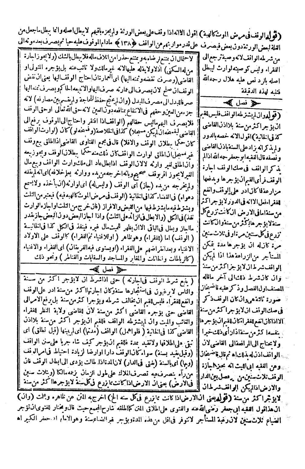 (فَصْلٌ) : (قَوْلُهُ وَإِنْ لَمْ يَشْتَرِطْهُ الْوَاقِفُ فَلَيْسَ لِلْقَيِّمِ أَنْ يُؤَجِّرَ أَكْثَرَ مِنْ سَنَةٍ بِلَا إذْنِ الْقَاضِي كَذَا فِي الْخَانِيَّةِ) أَقُولُ إلَّا أَنَّهُ خَصَّهُ بِالدُّورِ وَلَمْ يَذْكُرْ أَنَّهُ يُزَادُ عَلَى السَّنَةِ بِإِذْنِ الْقَاضِي، وَنَصُّهُ قَالَ الْفَقِيهُ أَبُو جَعْفَرٍ - رَحِمَهُ اللَّهُ - إذَا لَمْ يَذْكُرْ الْوَاقِفُ فِي صَكِّ الْوَقْفِ إجَارَةَ الْوَقْفِ فَرَأَى الْقَيِّمُ أَنْ يُؤَجِّرَهَا وَيَدْفَعَهَا مُزَارِعَةً فَمَا كَانَ أَدَرَّ عَلَى الْوَقْفِ وَأَنْفَعَ لِلْفُقَرَاءِ فَعَلَ إلَّا أَنَّهُ فِي الدُّورِ لَا يُؤَجِّرُ أَكْثَرَ مِنْ سَنَةٍ أَمَّا فِي الْأَرْضِ إنْ كَانَتْ تُزْرَعُ كُلَّ سَنَةٍ لَا يُؤَجِّرُهَا أَكْثَرَ مِنْ سَنَةٍ، وَإِنْ كَانَتْ تُزْرَعُ فِي كُلِّ سَنَتَيْنِ مَرَّةً أَوْ فِي ثَلَاثِ سِنِينَ مَرَّةً كَانَ لَهُ أَنْ يُؤَجِّرَهَا مُدَّةً يَتَمَكَّنُ الْمُسْتَأْجِرُ مِنْ الزِّرَاعَةِ هَذَا إذَا لَمْ يَكُنْ الْوَاقِفُ شَرَطَ أَنْ لَا يُؤَجِّرَ أَكْثَرَ مِنْ سَنَةٍ، وَإِنْ كَانَ شَرَطَ ذَلِكَ إلَى آخِرِ مَا قَالَهُ الْمُصَنِّفُ أَوَّلَ الْفَصْلِ.