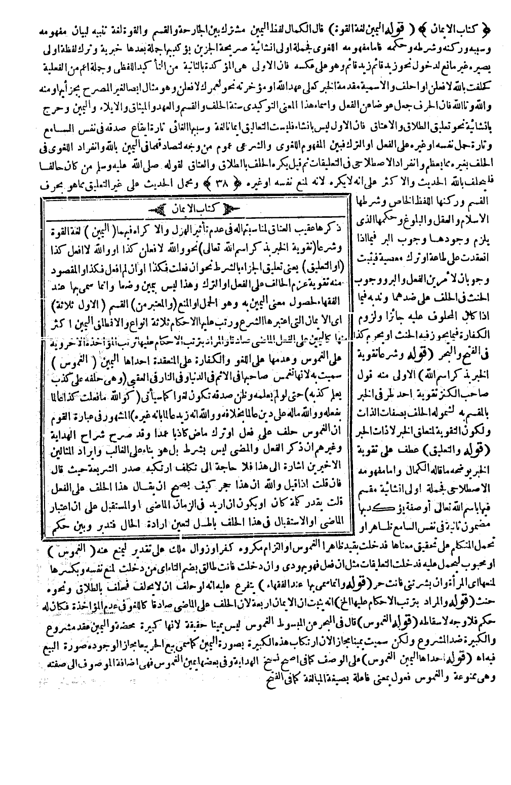 (كِتَابُ الْأَيْمَانِ) ذَكَرَهَا عَقِيبَ الْعَتَاقِ لِمُنَاسَبَتِهَا لَهُ فِي عَدَمِ تَأْثِيرِ الْهَزْلِ وَالْإِكْرَاهِ فِيهِمَا (الْيَمِينُ) لُغَةً: الْقُوَّةُ، وَشَرْعًا: (تَقْوِيَةُ الْخَبَرِ بِذِكْرِ اسْمِ اللَّهِ تَعَالَى) نَحْوَ: وَاَللَّهِ لَأَفْعَلَنَّ كَذَا أَوْ وَاَللَّهِ لَا أَفْعَلُ كَذَا (أَوْ التَّعْلِيقُ) يَعْنِي تَعْلِيقُ الْجَزَاءِ بِالشَّرْطِ نَحْوَ إنْ فَعَلْت فَكَذَا أَوْ إنْ لَمْ أَفْعَلْ فَكَذَا، وَالْمَقْصُودُ مِنْهُ تَقْوِيَةُ عَزْمِ الْحَالِفِ عَلَى الْفِعْلِ أَوْ التَّرْكِ وَهَذَا لَيْسَ بِيَمِينٍ وَضْعًا وَإِنَّمَا سُمِّيَ بِهَا عِنْدَ الْفُقَهَاءِ لِحُصُولِ مَعْنَى الْيَمِينِ بِهِ وَهُوَ الْحَمْلُ أَوْ الْمَنْعُ (وَالْمُعْتَبَرُ مِنْ) الْقِسْمِ (الْأَوَّلِ ثَلَاثَةٌ) أَيْ الْأَيْمَانُ الَّتِي اعْتَبَرَهَا الشَّرْعُ وَرَتَّبَ عَلَيْهَا الْأَحْكَامَ ثَلَاثَةُ أَنْوَاعٍ وَإِلَّا فَمُطْلَقُ الْيَمِينِ أَكْثَرُ مِنْهَا كَالْيَمِينِ عَلَى الْفِعْلِ الْمَاضِي صَادِقًا، وَالْمُرَادُ بِتَرَتُّبِ أَلِأَحْكَامِ عَلَيْهَا تَرَتُّبُ الْمُؤَاخَذَةِ الْأُخْرَوِيَّةِ عَلَى الْغَمُوسِ وَعَدَمُهَا عَلَى اللَّغْوِ، وَالْكَفَّارَةِ عَلَى الْمُنْعَقِدَةِ إحْدَاهَا الْيَمِينُ (الْغَمُوسُ) سُمِّيَتْ بِهِ؛ لِأَنَّهَا تَغْمِسُ صَاحِبَهَا فِي الْإِثْمِ فِي الدُّنْيَا وَفِي النَّارِ فِي الْعُقْبَى (وَهِيَ حَلِفُهُ عَلَى كَذِبٍ يَعْلَمُ كَذِبَهُ) حَتَّى لَوْ لَمْ يَعْلَمْهُ وَظَنَّ صِدْقَهُ تَكُونُ لَغْوًا كَمَا سَيَأْتِي (كَوَاللَّهِ مَا فَعَلْت كَذَا عَالِمًا بِفِعْلِهِ وَوَاللَّهِ مَا لَهُ عَلَى دَيْنٌ عَالِمًا بِخِلَافِهِ وَوَاللَّهِ إنَّهُ زَيْدٌ عَالِمًا بِأَنَّهُ غَيْرُهُ) الْمَشْهُورُ فِي عِبَارَةِ الْقَوْمِ أَنَّ الْغَمُوسَ حَلِفٌ عَلَى فِعْلٍ أَوْ تَرْكٍ مَاضٍ كَاذِبًا عَمْدًا، وَقَدْ صَرَّحَ شُرَّاحُ الْهِدَايَةِ وَغَيْرُهُمْ أَنَّ ذِكْرَ الْفِعْلِ وَالْمُضِيِّ لَيْسَ بِشَرْطٍ بَلْ هُوَ بِنَاءً عَلَى الْغَالِبِ وَإِيرَادُ الْمِثَالَيْنِ الْأَخِيرَيْنِ إشَارَةٌ إلَى هَذَا فَلَا حَاجَةَ إلَى تَكَلُّفٍ ارْتَكَبَهُ صَدْرُ الشَّرِيعَةِ حَيْثُ قَالَ: فَإِنْ قُلْت إذَا قِيلَ: وَاَللَّهِ إنَّ هَذَا حَجَرٌ كَيْفَ يَصِحُّ أَنْ يُقَالَ هَذَا الْحَلِفُ عَلَى الْفِعْلِ قُلْت يُقَدَّرُ كَلِمَةُ كَانَ أَوْ يَكُونُ إنْ أُرِيدَ فِي الزَّمَانِ الْمَاضِي أَوْ الْمُسْتَقْبَلِ عَلَى أَنَّ اعْتِبَارَ الْمَاضِي أَوْ الِاسْتِقْبَالِ فِي هَذَا الْحَلِفِ بَاطِلٌ لِتَعَيُّنِ إرَادَةِ الْحَالِ فَتَدَبَّرْ.