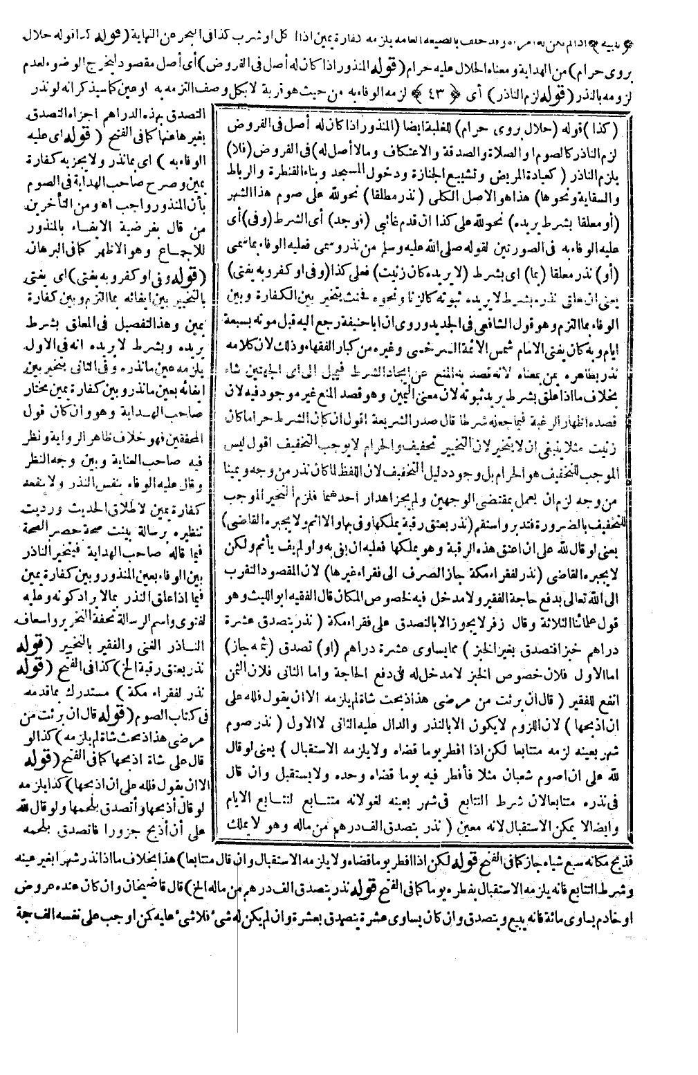وَقَالَ عَلَيْهِ الْوَفَاءُ بِنَفْسِ النَّذْرِ وَلَا يَنْفَعُهُ كَفَّارَةُ يَمِينٍ لِإِطْلَاقِ الْحَدِيثِ وَرَدَدْتُ تَنْظِيرَهُ بِرِسَالَةٍ بَيَّنَتْ صِحَّةَ حَصْرِ الصِّحَّةِ فِيمَا قَالَهُ صَاحِبُ الْهِدَايَةِ فَيَتَخَيَّرُ النَّاذِرُ بَيْنَ الْوَفَاءِ بِعَيْنِ الْمَنْذُورِ وَبَيْنَ كَفَّارَةِ يَمِينٍ فِيمَا إذَا عَلَّقَ النَّذْرَ بِمَا لَا يُرَادُ كَوْنُهُ وَعَلَيْهِ الْفَتْوَى وَاسْمُ الرِّسَالَةِ تُحْفَةُ التَّحْرِيرِ وَإِسْعَافُ النَّاذِرِ الْغَنِيِّ وَالْفَقِيرِ بِالتَّخْيِيرِ.