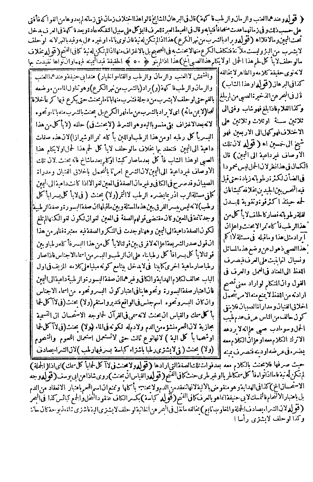 (وَلَا) يَحْنَثُ (فِي لَا آكُلُ لَحْمًا بِأَكْلِ سَمَكٍ) وَالْقِيَاسُ أَنْ يَحْنَثَ لِأَنَّهُ سُمِّيَ فِي الْقُرْآنِ لَحْمًا، وَجْهُ الِاسْتِحْسَانِ أَنَّ التَّسْمِيَةَ مَجَازِيَّةٌ لِأَنَّ اللَّحْمَ مُنْشَؤُهُ مِنْ الدَّمِ وَلَا دَمَ لَهُ لِكَوْنِهِ فِي الْمَاءِ (وَلَا) يَحْنَثُ (فِي لَا آكُلُ لَحْمًا أَوْ شَحْمًا بِأَكْلِ أَلْيَةٍ) لِأَنَّهَا نَوْعٌ ثَالِثٌ حَتَّى لَا تُسْتَعْمَلَ اسْتِعْمَالَ اللُّحُومِ وَالشُّحُومِ (وَلَا) يَحْنَثُ (فِي لَا يَشْتَرِي رُطَبًا بِاشْتِرَاءِ كِبَاسَةِ بُسْرٍ فِيهَا رُطَبٌ) لِأَنَّ الشِّرَاءَ يُصَادِفُ