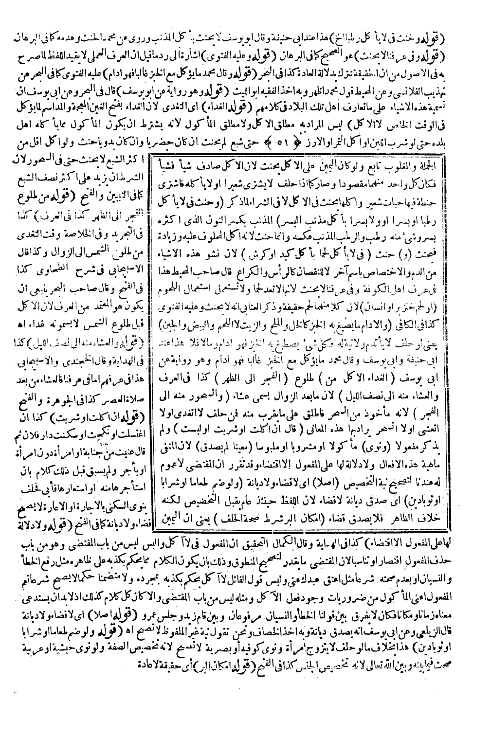 حَلَفَ لَا يَأْتَدِمُ وَلَا نِيَّةَ لَهُ (قَوْلُهُ وَقَالَ مُحَمَّدٌ مَا يُؤْكَلُ مَعَ الْخُبْزِ غَالِبًا فَهُوَ إدَامٌ) عَلَيْهِ الْفَتْوَى كَمَا فِي الْبَحْرِ عَنْ تَهْذِيبِ الْقَلَانِسِيِّ وَعَنْ الْمُحِيطِ قَوْلُ مُحَمَّدٍ أَظْهَرُ وَبِهِ أَخَذَ الْفَقِيهُ أَبُو اللَّيْثِ (قَوْلُهُ وَهُوَ رِوَايَةٌ عَنْ أَبِي يُوسُفَ) قَالَ فِي الْبَحْرِ وَعَنْ أَبِي يُوسُفَ أَنَّ تَسْمِيَةَ هَذِهِ الْأَشْيَاءِ عَلَى مَا تَعَارَفَ أَهْلُ تِلْكَ الْبِلَادِ فِي كَلَامِهِمْ (قَوْلُهُ الْغَدَاءُ) أَيْ التَّغَدِّي لِأَنَّ الْغَدَاءَ بِفَتْحِ الْغَيْنِ الْمُعْجَمَةِ وَالْمَدِّ اسْمٌ لِمَا يُؤْكَلُ فِي الْوَقْتِ الْخَاصِّ لَا الْأَكْلُ (قَوْلُهُ الْأَكْلُ) لَيْسَ الْمُرَادُ بِهِ مُطْلَقَ الْأَكْلِ وَلَا مُطْلَقَ الْمَأْكُولِ لِأَنَّهُ يُشْتَرَطُ أَنْ يَكُونَ الْمَأْكُولُ مِمَّا يَأْكُلُهُ أَهْلُ بَلَدِهِ حَتَّى لَوْ شَرِبَ اللَّبَنَ أَوْ أَكَلَ التَّمْرَ أَوْ الْأُرْزَ حَتَّى شَبِعَ لَمْ يَحْنَثْ إنْ كَانَ حَضَرِيًّا وَإِنْ كَانَ بَدَوِيًّا حَنِثَ وَلَوْ أَكَلَ أَقَلَّ مِنْ أَكْثَرِ الشِّبَعِ لَا يَحْنَثُ حَتَّى فِي السُّحُورِ لِأَنَّ الشَّرْطَ أَنْ يَزِيدَ عَلَى أَكْثَرِ نِصْفِ الشِّبَعِ كَمَا فِي التَّبْيِينِ وَالْفَتْحِ (قَوْلُهُ مِنْ طُلُوعِ الْفَجْرِ إلَى الظُّهْرِ كَذَا فِي الْعُرْفِ) كَذَا فِي التَّجْرِيدِ.