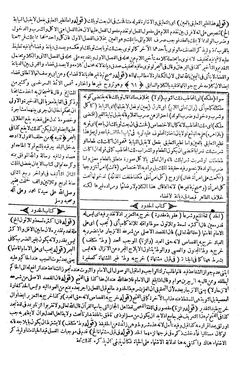 (كِتَابُ الْحُدُودِ) (قَوْلُهُ فَإِنَّ أَكْثَرَهُ تِسْعَةٌ وَثَلَاثُونَ. . . إلَخْ) عِلَّةٌ لِعَدَمِ تَقْدِيرِهِ لِأَنَّ مَا بَيْنَ الْأَقَلِّ وَالْأَكْثَرِ لَيْسَ بِمُقَدَّرٍ وَلِأَنَّهُ يَكُونُ بِغَيْرِ الضَّرْبِ كَمَا فِي الْبَحْرِ (قَوْلُهُ يَجِبُ أَيْ عَلَى الْإِمَامِ إقَامَتُهَا) يَعْنِي بَعْدَ ثُبُوتِ السَّبَبِ عِنْدَ الْحَاكِمِ وَعَلَيْهِ ابْتَنَى عَدَمُ جَوَازِ الشَّفَاعَةِ فِيهِ فَإِنَّهَا طَلَبُ تَرْكِ الْوَاجِبِ وَأَمَّا قَبْلَ الْوُصُولِ إلَى الْإِمَامِ وَالثُّبُوتِ عِنْدَهُ تَجُوزُ الشَّفَاعَةُ عِنْدَ الرَّافِعِ لَهُ إلَى الْحَاكِمِ لِيُطْلِقَهُ وَمِمَّنْ قَالَ بِهِ الزُّبَيْرُ بْنُ الْعَوَّامِ وَقَالَ إذَا بَلَغَ إلَى الْإِمَامِ فَلَا عَفَا اللَّهُ عَنْهُ إنْ عَفَا كَذَا فِي الْفَتْحِ (قَوْلُهُ فَإِنَّ الْمَقْصِدَ الْأَصْلِيَّ مِنْ شَرْعِهِ الِانْزِجَارُ) يَعْنِي الِانْزِجَارَ بَعْدَهُ لِأَنَّ التَّحْقِيقَ أَنَّ الْعِلْمَ بِشَرْعِيَّةِ الْحُدُودِ مَانِعٌ قَبْلَ الْفِعْلِ زَاجِرٌ بَعْدَهُ يَمْنَعُ مِنْ الْعَوْدِ إلَيْهِ وَلَيْسَ الْحَدُّ كَفَّارَةً لِلْمَعْصِيَةِ بَلْ التَّوْبَةُ هِيَ الْمُسْقِطَةُ عَنْهُ عَذَابَ الْآخِرَةِ كَمَا فِي الْفَتْحِ (قَوْلُهُ خَرَجَ بِهِ الْقِصَاصُ لِأَنَّهُ حَقُّ الْعَبْدِ) وَكَذَا خَرَجَ بِهِ التَّعْزِيرُ أَيْضًا وَإِنْ خَرَجَ بِقَيْدِ التَّقْدِيرِ (قَوْلُهُ وَالزِّنَا) مَقْصُورٌ فِي اللُّغَةِ الْفُصْحَى لُغَةِ أَهْلِ الْحِجَازِ الَّتِي جَاءَ بِهَا الْقُرْآنُ قَالَ اللَّهُ تَعَالَى {وَلا تَقْرَبُوا الزِّنَا} [الإسراء: 32] وَيُمَدُّ فِي لُغَةِ نَجْدٍ كَذَا فِي الْفَتْحِ ثُمَّ هَذَا التَّعْرِيفُ غَيْرُ جَامِعٍ إذْ لَا بُدَّ أَنْ يَكُونَ مِنْ مُسْلِمٍ أَوْ ذِمِّيٍّ نَاطِقٍ بِنَاطِقَةٍ بِدَارِنَا تَحْتَ وِلَايَةِ أَهْلِ الْعَدْلِ وَأَنْ لَا يَظْهَرَ بِهِ جَبٌّ أَوْ رَتْقٌ بَعْدَ إقْرَارِهِ بِهِ كَذَا قِيلَ وَفِيهِ تَأَمُّلٌ لِأَنَّهُ هَذِهِ شُرُوطٌ وَهِيَ زَائِدَةٌ عَنْ الْحَقِيقَةِ (قَوْلُهُ وَطْءُ مُكَلَّفٍ) لَا يُشْتَرَطُ أَنْ يَكُونَ بِإِيلَاجِهِ فَإِنَّهُ لَوْ كَانَ مُسْتَلْقِيًا فَأَدْخَلَتْ ذَكَرَهُ فِي فَرْجِهَا لَزِمَهُمَا الْحَدُّ (قَوْلُهُ فِي قُبُلِ مُشْتَهَاةٍ. . . إلَخْ) قَدَّمَ فِي مُوجِبَاتِ الْغُسْلِ قَيْدَ الْحَيَاةِ مَتْنًا وَلَمْ يَذْكُرْ قَيْدَ الِاشْتِهَاءِ هُنَاكَ وَاكْتَفَى بِهِ هُنَا لِدَلَالَةِ الِاشْتِهَاءِ عَلَى الْحَيَاةِ فَكَانَ يَنْبَغِي أَنْ يَذْكُرَهُ كَذَلِكَ ثَمَّةَ