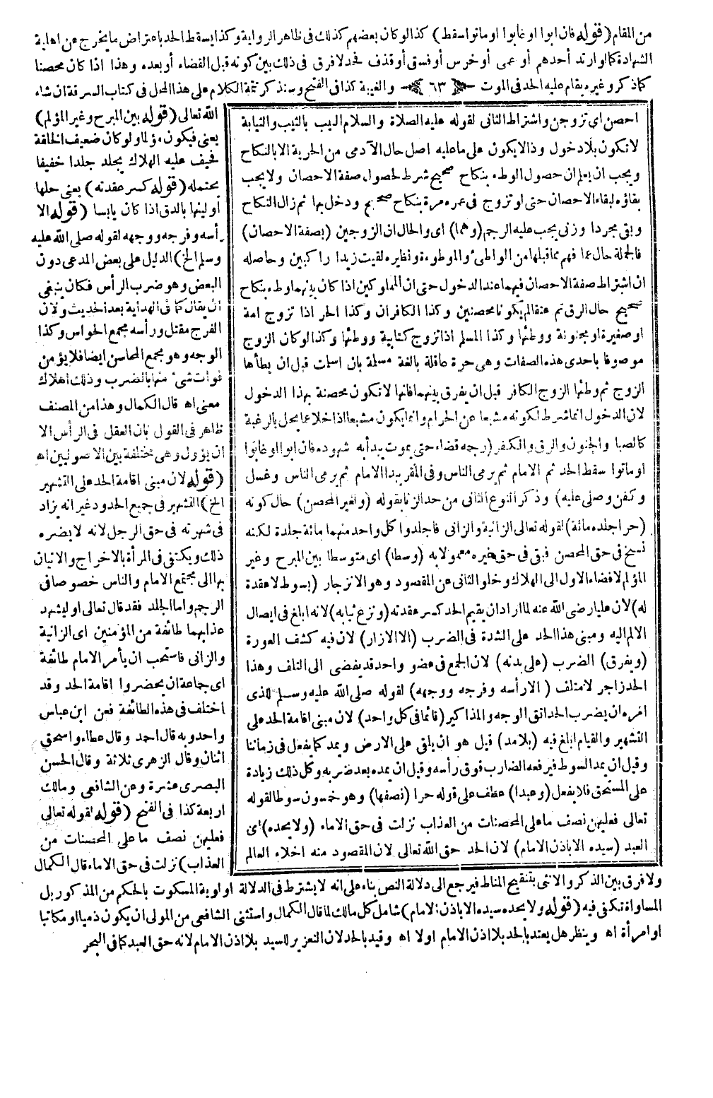 (قَوْلُهُ لِأَنَّ مَبْنَى إقَامَةِ الْحَدِّ عَلَى التَّشْهِيرِ. . . إلَخْ) التَّشْهِيرُ فِي جَمِيعِ الْحُدُودِ غَيْرَ أَنَّهُ يُزَادُ فِي شُهْرَتِهِ فِي حَقِّ الرَّجُلِ لِأَنَّهُ لَا يَضُرُّهُ ذَلِكَ وَيُكْتَفَى فِي الْمَرْأَةِ بِالْإِخْرَاجِ وَالْإِتْيَانِ بِهَا إلَى مُجْتَمَعِ الْإِمَامِ وَالنَّاسِ خُصُوصًا فِي الرَّجْمِ وَأَمَّا الْجَلْدُ فَقَدْ قَالَ تَعَالَى وَلْيَشْهَدْ عَذَابَهُمَا طَائِفَةٌ مِنْ الْمُؤْمِنِينَ أَيْ الزَّانِيَةِ وَالزَّانِي فَاسْتُحِبَّ أَنْ يَأْمُرَ الْإِمَامُ طَائِفَةً أَيْ جَمَاعَةً أَنْ يَحْضُرُوا إقَامَةَ الْحَدِّ وَقَدْ اُخْتُلِفَ فِي هَذِهِ الطَّائِفَةِ فَعَنْ ابْنِ عَبَّاسٍ وَاحِدٌ وَبِهِ قَالَ أَحْمَدُ وَقَالَ عَطَاءٌ وَإِسْحَاقُ اثْنَانِ وَقَالَ الزُّهْرِيُّ ثَلَاثَةٌ وَقَالَ الْحَسَنُ الْبَصْرِيُّ عَشَرَةٌ وَعَنْ الشَّافِعِيِّ وَمَالِكٍ أَرْبَعَةٌ كَذَا فِي الْفَتْحِ (قَوْلُهُ لِقَوْلِهِ تَعَالَى {فَعَلَيْهِنَّ نِصْفُ مَا عَلَى الْمُحْصَنَاتِ مِنَ الْعَذَابِ} [النساء: 25] نَزَلَتْ فِي حَقِّ الْإِمَاءِ قَالَ الْكَمَالُ وَلَا فَرْقَ بَيْنَ الذَّكَرِ وَالْأُنْثَى بِتَنْقِيحِ الْمَنَاطِ فَيَرْجِعُ إلَى دَلَالَةِ النَّصِّ بِنَاءً عَلَى أَنَّهُ لَا يُشْتَرَطُ فِي الدَّلَالَةِ أَوْلَوِيَّةُ الْمَسْكُوتِ بِالْحُكْمِ مِنْ الْمَذْكُورِ بَلْ الْمُسَاوَاةُ تَكْفِي فِيهِ (قَوْلُهُ وَلَا يَحُدُّهُ سَيِّدُهُ إلَّا بِإِذْنِ الْإِمَامِ) شَامِلٌ كُلَّ مَالِكٍ لِمَا قَالَ الْكَمَالُ وَاسْتَثْنَى الشَّافِعِيُّ مِنْ الْمَوْلَى أَنْ يَكُونَ ذِمِّيًّا أَوْ مُكَاتَبًا أَوْ امْرَأَةً اهـ.