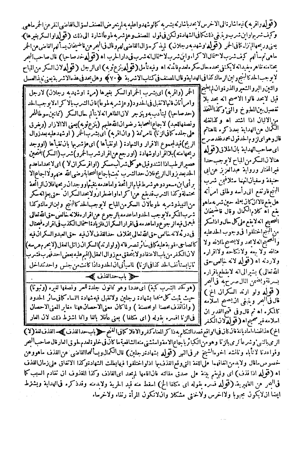 الْخَمْرِ (وَأَقَرَّ بِهِ) أَيْ بِشُرْبِ الْخَمْرِ أَوْ السُّكْرِ بِغَيْرِهَا (مَرَّةً أَوْ شَهِدَ بِهِ رَجُلَانِ) لَا رَجُلٌ وَامْرَأَتَانِ فَإِنَّهَا لَا تُقْبَلُ فِي الْحُدُودِ (وَعُلِمَ شُرْبُهُ طَوْعًا) فَإِنَّ الشُّرْبَ بِالْإِكْرَاهِ لَا يُوجِبُ الْحَدَّ (حُدَّ صَاحِيًا) لِيَتَأَدَّبَ بِهِ وَيَنْزَجِرَ لِأَنَّ الظَّاهِرَ أَنَّهُ لَا يَتَأَلَّمُ حَالَ السُّكْرِ (ثَمَانِينَ سَوْطًا لِلْحُرِّ وَنِصْفُهَا لِلْعَبْدِ) لِإِجْمَاعِ الصَّحَابَةِ - رِضْوَانُ اللَّهِ عَلَيْهِمْ - (يُنْزَعُ ثَوْبُهُ) يَعْنِي إلَّا الْإِزَارَ (وَيُفَرَّقُ عَلَى جِلْدِهِ كَمَا فِي الزِّنَا) لِمَا مَرَّ ثَمَّةَ (وَإِنْ أَقَرَّ بِهِ) أَيْ بِشُرْبِ الْخَمْرِ (أَوْ شَهِدَ عَلَيْهِ بَعْدَ زَوَالِ الرِّيحِ) قَيْدٌ لِمَجْمُوعِ الْإِقْرَارِ وَالشَّهَادَةِ (أَوْ تَقَيَّأَهَا) أَيْ عُلِمَ شُرْبُهَا بِأَنْ تَقَيَّأَهَا (أَوْ وُجِدَ رِيحُهَا مِنْهُ) بِلَا إقْرَارٍ أَوْ شَهَادَةٍ (أَوْ رَجَعَ عَنْ إقْرَارِ شُرْبِ الْخَمْرِ، وَ) شَرِبَ (السَّكَرَ) بِفَتْحَتَيْنِ عَصِيرَ الرُّطَبِ إذَا اشْتَدَّ وَقِيلَ هُوَ كُلُّ شَرَابٍ مُسْكِرٍ (أَوْ أَقَرَّ سَكْرَانُ لَا) أَيْ لَا يُحَدُّ أَمَّا عَدَمُ الْحَدِّ بَعْدَ زَوَالِ الرِّيحِ فَلِأَنَّ حَدَّ الشُّرْبِ ثَبَتَ بِإِجْمَاعِ الصَّحَابَةِ - رَضِيَ اللَّهُ عَنْهُمْ - وَلَا إجْمَاعَ إلَّا بِرَأْيِ ابْنِ مَسْعُودٍ وَهُوَ شَرْطُ قِيَامِ الرَّائِحَةِ وَأَمَّا عَدَمُهُ بِتَقَيُّئِهَا وَوُجِدَ أَنَّ رِيحَهَا فَلِأَنَّ الرَّائِحَةَ مُحْتَمَلَةٌ وَكَذَا الشُّرْبُ قَدْ يَقَعُ عَنْ إكْرَاهٍ وَاضْطِرَارٍ وَلَا يُحَدُّ السَّكْرَانُ حَتَّى يُعْلَمَ أَنَّهُ سَكِرَ مِنْ النَّبِيذِ وَشَرِبَهُ طَوْعًا لِأَنَّ السُّكْرَ مِنْ الْمُبَاحِ لَا يُوجِبُ الْحَدَّ كَالْبَنْجِ وَلَبَنِ الرِّمَاكِ وَكَذَا شُرْبُ الْمُكْرَهِ لَا يُوجِبُ وَأَمَّا عَدَمُهُ بِالرُّجُوعِ عَنْ إقْرَارِهِ فَلِأَنَّهُ خَالِصُ حَقِّ اللَّهِ تَعَالَى فَيَعْمَلُ فِيهِ الرُّجُوعُ وَأَمَّا عَدَمُهُ فِي إقْرَارِ السَّكْرَانِ فَلِزِيَادَةِ احْتِمَالِ الْكَذِبِ فِي إقْرَارِهِ فَيُحْتَالُ فِي دَرْئِهِ لِأَنَّهُ خَالِصُ حَقِّ اللَّهِ تَعَالَى بِخِلَافِ حَدِّ الْقَذْفِ لِأَنَّ فِيهِ حَقَّ الْعَبْدِ وَالسَّكْرَانُ فِيهِ كَالصَّاحِي عُقُوبَةً عَلَيْهِ كَمَا فِي سَائِرِ تَصَرُّفَاتِهِ (وَلَوْ ارْتَدَّ) السَّكْرَانُ زَائِلُ الْعَقْلِ (لَا يَحْرُمُ عِرْسُهُ) لِأَنَّ الْكُفْرَ مِنْ بَابِ الِاعْتِقَادِ وَلَا يَتَحَقَّقُ مَعَ زَوَالِ الْعَقْلِ (أُقِيمَ عَلَيْهِ بَعْضُ الْحَدِّ فَهَرَبَ فَشَرِبَ ثَانِيًا يُسْتَأْنَفُ الْحَدُّ كَذَا فِي الزِّنَا) لِمَا سَيَأْتِي أَنَّ الْحُدُودَ إذَا كَانَتْ مِنْ جِنْسٍ وَاحِدٍ تَتَدَاخَلُ