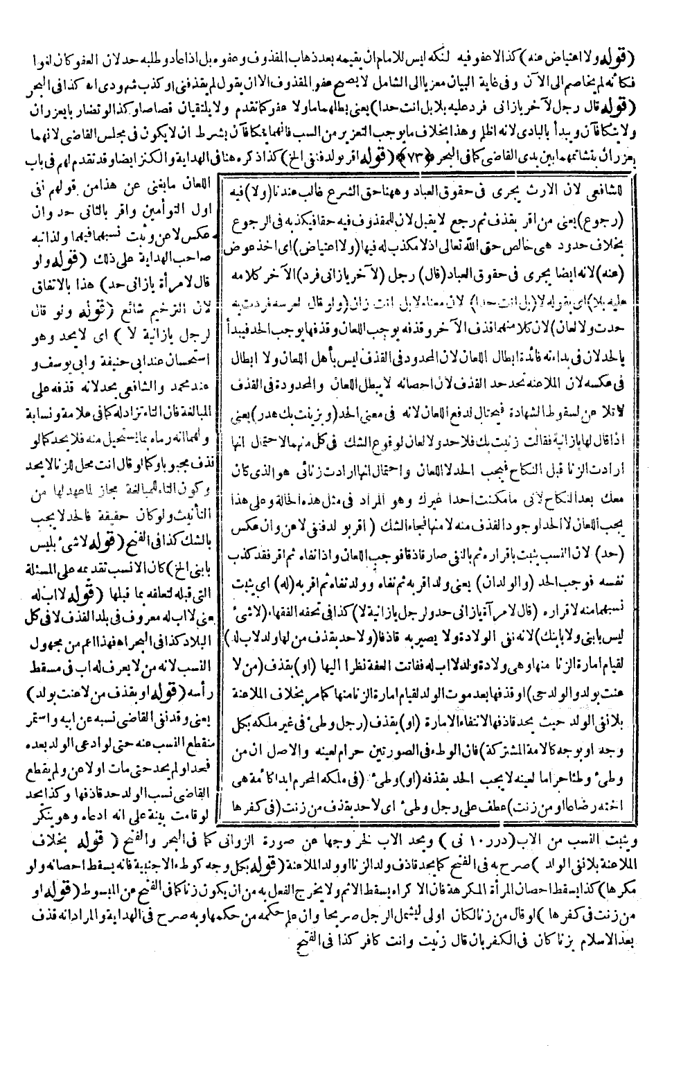 (قَالَ) رَجُلٌ (لِآخَرَ يَا زَانِي فَرَدَّ) الْآخَرُ كَلَامَهُ عَلَيْهِ بِلَا أَيْ بِقَوْلِهِ لَا (بَلْ أَنْتَ حُدَّا) لِأَنَّ مَعْنَاهُ لَا بَلْ أَنْتَ زَانٍ (وَلَوْ قَالَ لِعِرْسِهِ فَرُدَّتْ بِهِ حُدَّتْ وَلَا لِعَانَ) لِأَنَّ كُلًّا مِنْهُمَا قَذَفَ الْآخَرَ وَقَذْفُهُ يُوجِبُ اللِّعَانَ وَقَذْفُهَا يُوجِبُ الْحَدَّ فَيُبْدَأُ بِالْحَدِّ لِأَنَّ فِي بُدَاءَتِهِ فَائِدَةَ إبْطَالِ اللِّعَانِ لِأَنَّ الْمَحْدُودَ فِي الْقَذْفِ لَيْسَ بِأَهْلِ اللِّعَانِ وَلَا إبْطَالَ فِي عَكْسِهِ لِأَنَّ الْمُلَاعَنَةَ تُحَدُّ حَدَّ الْقَذْفِ لِأَنَّ إحْصَانَهُ لَا يُبْطِلُ اللِّعَانَ وَالْمَحْدُودَةُ فِي الْقَذْفِ لَا تُلَاعَنُ لِسُقُوطِ الشَّهَادَةِ فَيُحْتَالُ لِدَفْعِ اللِّعَانِ لِأَنَّهُ فِي مَعْنَى الْحَدِّ (وَبِزَنَيْتُ بِك هَدَرٌ) يَعْنِي إذَا قَالَ لَهَا يَا زَانِيَةُ فَقَالَتْ زَنَيْتُ بِكَ فَلَا حَدَّ وَلَا لِعَانَ لِوُقُوعِ الشَّكِّ فِي كُلٍّ مِنْهُمَا لِاحْتِمَالِ أَنَّهَا أَرَادَتْ الزِّنَا قَبْلَ النِّكَاحِ فَيَجِبُ الْحَدُّ لَا اللِّعَانُ وَاحْتِمَالُ أَنَّهَا أَرَادَتْ زَنَائِي هُوَ الَّذِي كَانَ مَعَك بَعْدَ النِّكَاحِ لِأَنِّي مَا مَكَّنْت أَحَدًا غَيْرَك وَهُوَ الْمُرَادُ فِي مِثْلِ هَذِهِ الْحَالَةِ وَعَلَى هَذَا يَجِبُ اللِّعَانُ لِأَنَّ الْحَدَّ لِوُجُودِ الْقَذْفِ مِنْهُ لَا مِنْهَا فَجَاءَ الشَّكُّ