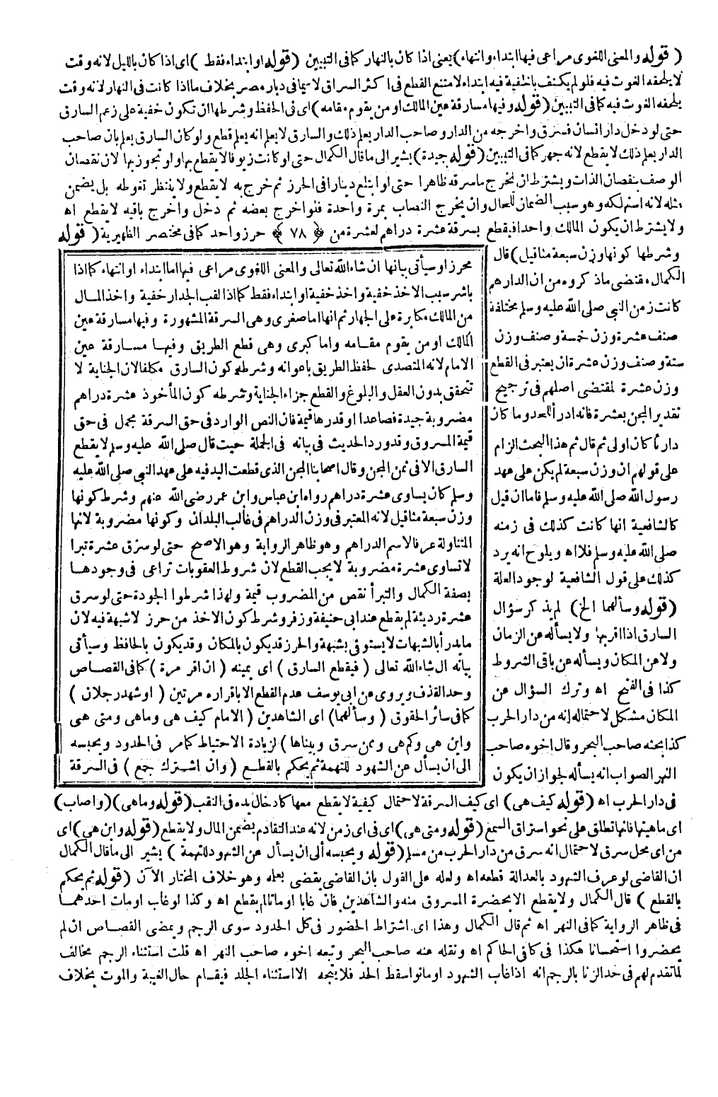 مُحْرِزًا أَوْ سَيَأْتِي بَيَانُهَا إنْ شَاءَ اللَّهُ تَعَالَى وَالْمَعْنَى اللُّغَوِيُّ مُرَاعًى فِيهَا إمَّا ابْتِدَاءً أَوْ انْتِهَاءً كَمَا إذَا بَاشَرَ سَبَبَ الْأَخْذِ خُفْيَةً وَأَخَذَ خُفْيَةً أَوْ ابْتِدَاءً فَقَطْ كَمَا إذَا نَقَبَ الْجِدَارَ خُفْيَةً وَأَخَذَ الْمَالَ مِنْ الْمَالِكِ مُكَابَرَةً عَلَى الْجِهَارِ ثُمَّ إنَّهَا إمَّا صُغْرَى وَهِيَ السَّرِقَةُ الْمَشْهُورَةُ وَفِيهَا مُسَارَقَةُ عَيْنِ الْمَالِكِ أَوْ مَنْ يَقُومُ مَقَامَهُ وَإِمَّا كُبْرَى وَهِيَ قَطْعُ الطَّرِيقِ وَفِيهَا مُسَارَقَةُ عَيْنِ الْإِمَامِ لِأَنَّهُ الْمُتَصَدِّي لِحِفْظِ الطَّرِيقِ بِأَعْوَانِهِ وَشَرْطُهُ كَوْنُ السَّارِقِ مُكَلَّفًا لِأَنَّ الْجِنَايَةَ لَا تَتَحَقَّقُ بِدُونِ الْعَقْلِ وَالْبُلُوغِ وَالْقَطْعُ جَزَاءُ الْجِنَايَةِ وَشَرْطُهُ كَوْنُ الْمَأْخُوذِ عَشَرَةَ دَرَاهِمَ مَضْرُوبَةٍ جَيِّدَةٍ فَصَاعِدًا أَوْ قَدْرَهَا قِيمَةً فَإِنَّ النَّصَّ الْوَارِدَ فِي حَقِّ السَّرِقَةِ مُجْمَلٌ فِي حَقِّ قِيمَةِ الْمَسْرُوقِ وَقَدْ وَرَدَ الْحَدِيثُ فِي بَيَانِهِ فِي الْجُمْلَةِ حَيْثُ قَالَ - صَلَّى اللَّهُ عَلَيْهِ وَسَلَّمَ - «لَا يُقْطَعُ السَّارِقُ إلَّا فِي ثَمَنِ الْمِجَنِّ» وَقَالَ أَصْحَابُنَا الْمِجَنُّ الَّذِي قُطِعَتْ الْيَدُ فِيهِ عَلَى عَهْدِ النَّبِيِّ - صَلَّى اللَّهُ عَلَيْهِ وَسَلَّمَ - كَانَ يُسَاوِي عَشَرَةَ دَرَاهِمَ رَوَاهُ ابْنُ عَبَّاسٍ وَابْنُ عُمَرَ - رَضِيَ اللَّهُ عَنْهُمْ - وَشَرْطُ كَوْنِهَا وَزْنَ سَبْعَةِ مَثَاقِيلَ لِأَنَّهُ الْمُعْتَبَرُ فِي وَزْنِ الدَّرَاهِمِ فِي غَالِبِ الْبُلْدَانِ وَكَوْنُهَا مَضْرُوبَةً لِأَنَّهَا الْمُتَنَاوِلَةُ عُرْفًا لِاسْمِ الدَّرَاهِمِ وَهُوَ ظَاهِرُ الرِّوَايَةِ وَهُوَ الْأَصَحُّ حَتَّى لَوْ سَرَقَ عَشَرَةً تِبْرًا لَا تُسَاوِي عَشَرَةً مَضْرُوبَةً لَا يَجِبُ الْقَطْعُ لِأَنَّ شُرُوطَ الْعُقُوبَاتِ تُرَاعَى فِي وُجُودِهَا بِصِفَةِ الْكَمَالِ وَالتِّبْرُ أَنْقَصُ مِنْ الْمَضْرُوبِ قِيمَةً وَلِهَذَا شَرَطُوا الْجَوْدَةَ حَتَّى لَوْ سَرَقَ عَشَرَةً رَدِيئَةً لَمْ يُقْطَعْ عِنْدَ أَبِي حَنِيفَةَ وَزُفَرَ وَشَرْطُ كَوْنِ الْأَخْذِ مِنْ حِرْزٍ لَا شُبْهَةَ فِيهِ؛ لِأَنَّ مَا يُدْرَأُ بِالشُّبُهَاتِ لَا يُسْتَوْفَى بِشُبْهَةٍ وَالْحِرْزُ قَدْ يَكُونُ بِالْمَكَانِ وَقَدْ يَكُونُ بِالْحَافِظِ وَسَيَأْتِي بَيَانُهُ إنْ شَاءَ اللَّهُ تَعَالَى (فَيُقْطَعُ السَّارِقُ) أَيْ يَمِينُهُ (إنْ أَقَرَّ مَرَّةً) كَمَا فِي الْقِصَاصِ وَحَدِّ الْقَذْفِ وَيُرْوَى عَنْ أَبِي يُوسُفَ عَدَمُ الْقَطْعِ إلَّا بِإِقْرَارِهِ مَرَّتَيْنِ (أَوْ شَهِدَ رَجُلَانِ) كَمَا فِي سَائِرِ الْحُقُوقِ (وَسَأَلَهُمَا) أَيْ الشَّاهِدَيْنِ (الْإِمَامُ كَيْفَ هِيَ وَمَا هِيَ وَمَتَى هِيَ وَأَيْنَ هِيَ وَكَمْ هِيَ وَمِمَّنْ سَرَقَ وَبَيَانُهَا) لِزِيَادَةِ الِاحْتِيَاطِ كَمَا مَرَّ فِي الْحُدُودِ وَيَحْبِسُهُ إلَى أَنْ يَسْأَلَ عَنْ الشُّهُودِ لِلتُّهْمَةِ ثُمَّ يَحْكُمُ بِالْقَطْعِ