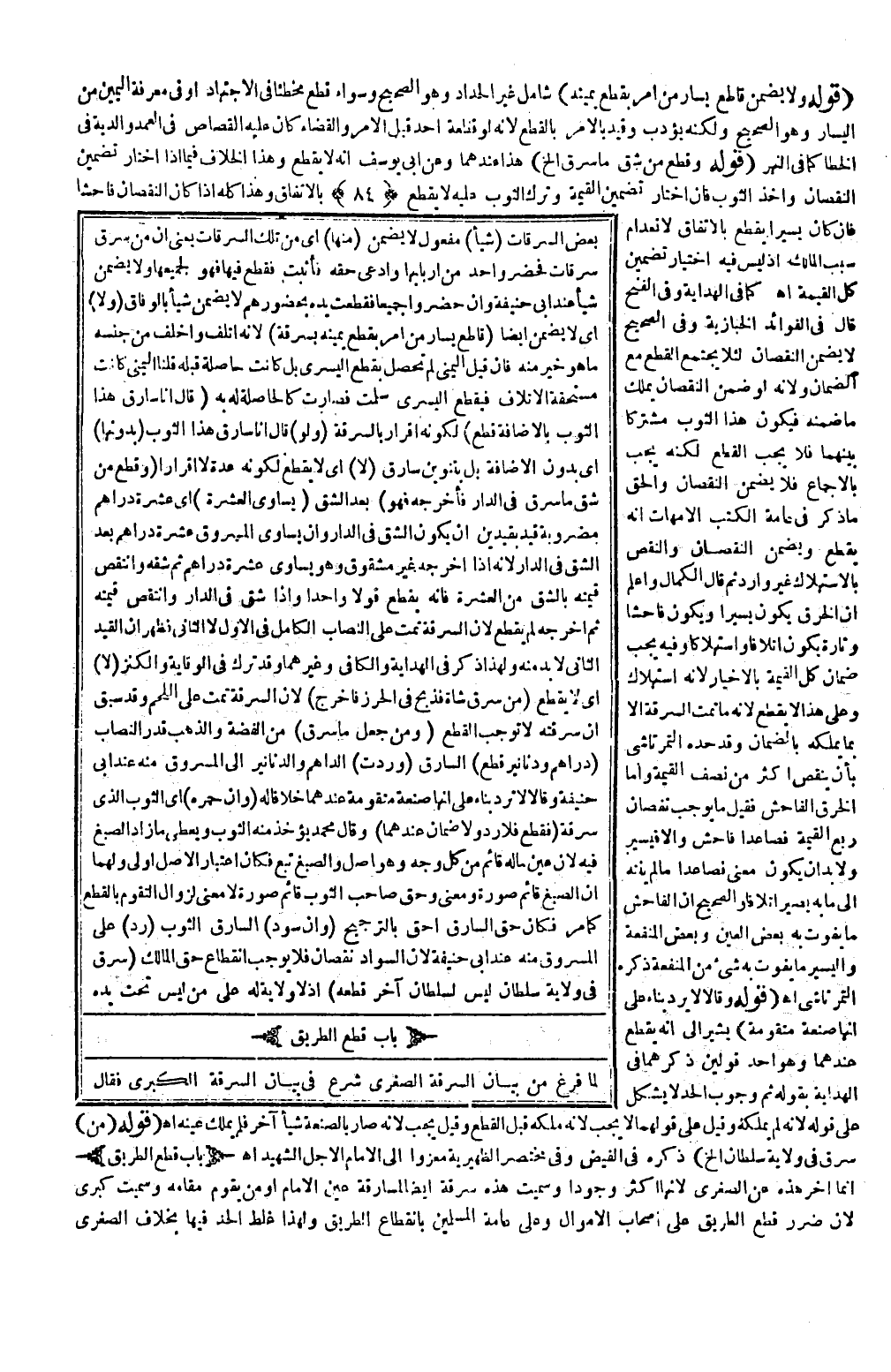 (بَابُ قَطْعِ الطَّرِيقِ) إنَّمَا أَخَّرَ هَذِهِ عَنْ الصُّغْرَى لِأَنَّهَا أَكْثَرُ وُجُودًا وَسُمِّيَتْ هَذِهِ سَرِقَةً أَيْضًا لِمُسَارَقَةِ عَيْنِ الْإِمَامِ أَوْ مَنْ يَقُومُ مَقَامَهُ وَسُمِّيَتْ كُبْرَى لِأَنَّ ضَرَرَ قَطْعِ الطَّرِيقِ عَلَى أَصْحَابِ الْأَمْوَالِ وَعَلَى عَامَّةِ الْمُسْلِمِينَ بِانْقِطَاعِ الطَّرِيقِ وَلِهَذَا غُلِّظَ الْحَدُّ فِيهَا بِخِلَافِ الصُّغْرَى