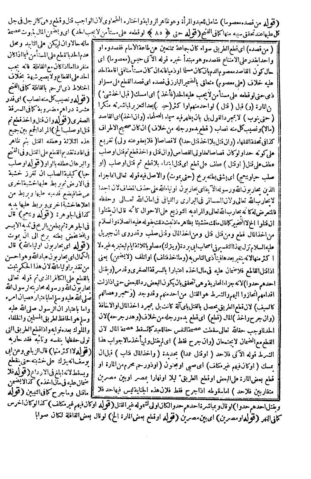 (قَوْلُهُ فَلَا ضَمَانَ عَلَيْهِ فِي مَالٍ أَخَذَهُ) كَذَا لَا يَضْمَنُ مَا قَتَلَ وَمَا جَرَحَ كَمَا فِي التَّبْيِينِ (قَوْلُهُ وَبِقَتْلِ أَحَدِهِمْ حُدُّوا) أَوْ قَالَ وَبِمُبَاشَرَةِ أَحَدِهِمْ حُدُّوا لَكَانَ أَوْلَى لِشُمُولِهِ غَيْرَ الْقَتْلِ (قَوْلُهُ أَوْ كَانَ فِيهِمْ غَيْرُ مُكَلَّفٍ) كَذَا لَوْ كَانَ أَخْرَسَ كَمَا فِي النَّهْرِ (قَوْلُهُ أَوْ مِصْرَيْنِ) أَيْ بَيْنَ مِصْرَيْنِ (قَوْلُهُ أَوْ قَطَعَ بَعْضُ الْمَارَّةِ. . . إلَخْ) لَوْ قَالَ بَعْضُ الْقَافِلَةِ لَكَانَ صَوَابًا