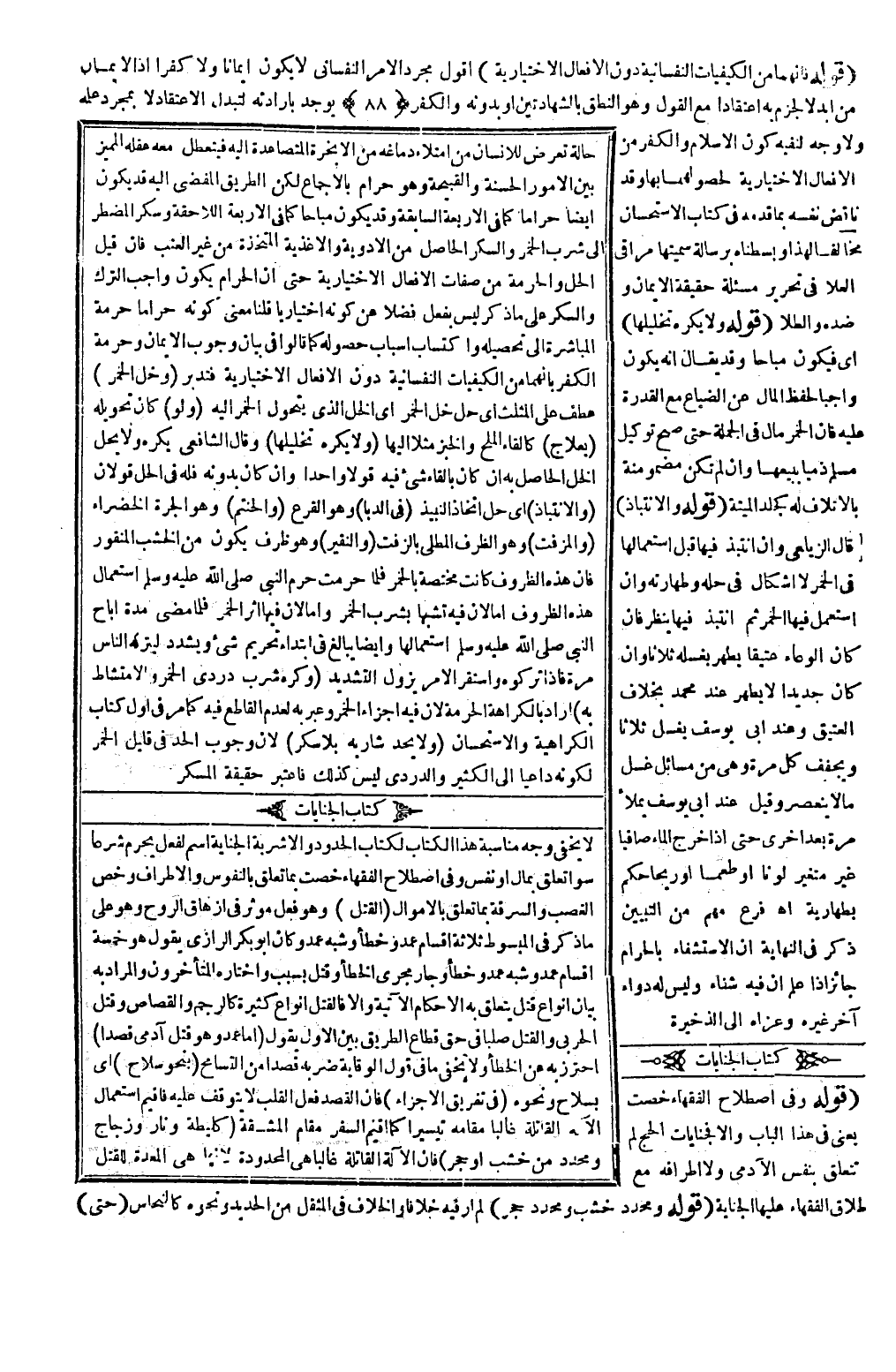 (كِتَابُ الْجِنَايَاتِ) لَا يَخْفَى وَجْهُ مُنَاسَبَةِ هَذَا الْكِتَابِ لِكِتَابِ الْحُدُودِ وَالْأَشْرِبَةِ الْجِنَايَةُ اسْمٌ لِفِعْلٍ يَحْرُمُ شَرْعًا سَوَاءٌ تَعَلَّقَ بِمَالٍ أَوْ نَفْسٍ وَفِي اصْطِلَاحِ الْفُقَهَاءِ خُصَّتْ بِمَا تَعَلَّقَ بِالنُّفُوسِ وَالْأَطْرَافِ وَخُصَّ الْغَصْبُ وَالسَّرِقَةُ بِمَا تَعَلَّقَ بِالْأَمْوَالِ (الْقَتْل) وَهُوَ فِعْلٌ مُؤَثِّرٌ فِي إزْهَاقِ الرُّوحِ وَهُوَ عَلَى مَا ذُكِرَ فِي الْمَبْسُوطِ ثَلَاثَةُ أَقْسَامٍ عَمْدٌ وَخَطَأٌ وَشِبْهُ عَمْدٍ وَكَانَ أَبُو بَكْرٍ الرَّازِيّ يَقُولُ هُوَ خَمْسَةُ أَقْسَامٍ عَمْدٌ وَشِبْهُ عَمْدٍ وَخَطَأٌ وَجَارٍ مَجْرَى الْخَطَأِ وَقَتْلٌ بِسَبَبٍ وَاخْتَارَهُ الْمُتَأَخِّرُونَ وَالْمُرَادُ بِهِ بَيَانُ أَنْوَاعِ قَتْلٍ يَتَعَلَّقُ بِهِ الْأَحْكَامُ الْآتِيَةُ وَإِلَّا فَالْقَتْلُ أَنْوَاعٌ كَثِيرَةٌ كَالرَّجْمِ وَالْقِصَاصِ وَقَتْلِ الْحَرْبِيِّ وَالْقَتْلِ صَلْبًا فِي حَقِّ قُطَّاعِ الطَّرِيقِ بَيَّنَ الْأَوَّلَ بِقَوْلِهِ (أَمَّا عَمْدٌ وَهُوَ قَتْلُ آدَمِيٍّ قَصْدًا) احْتَرَزَ بِهِ عَنْ الْخَطَأِ وَلَا يَخْفَى مَا فِي قَوْلِ الْوِقَايَةِ ضَرَبَهُ قَصْدًا مِنْ التَّسَامُحِ (بِنَحْوِ سِلَاحٍ) أَيْ بِسِلَاحٍ وَنَحْوِهِ (فِي تَفْرِيقِ الْأَجْزَاءِ) فَإِنَّ الْقَصْدَ فِعْلُ الْقَلْبِ لَا يَتَوَقَّفُ عَلَيْهِ فَأُقِيمَ اسْتِعْمَالُ الْآلَةِ الْقَاتِلَةِ غَالِبًا مَقَامَهُ تَيْسِيرًا كَمَا أُقِيمَ السَّفَرُ مَقَامَ الْمَشَقَّةِ (كَلِيطَةٍ وَنَارٍ وَزُجَاجٍ وَمُحَدَّدٍ مِنْ خَشَبٍ أَوْ حَجَرٍ) فَإِنَّ الْآلَةَ الْقَاتِلَةَ غَالِبًا هِيَ الْمَحْدُودَةُ لِأَنَّهَا هِيَ الْمُعَدَّةُ لِلْقَتْلِ