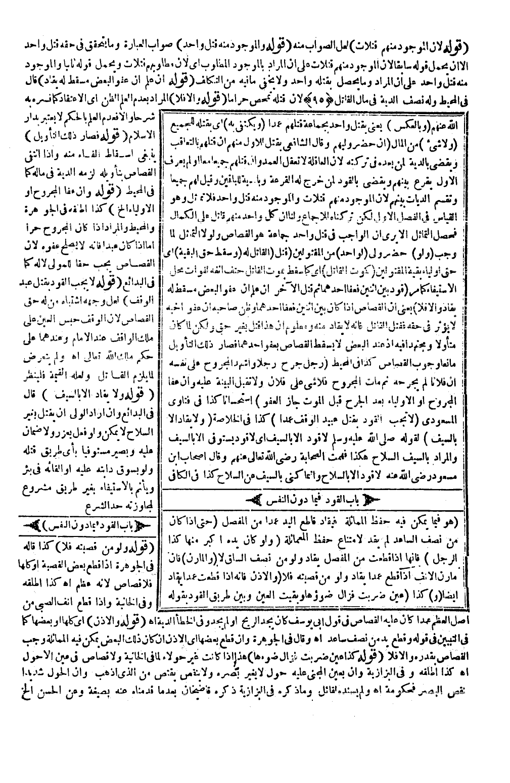 (بَابُ الْقَوَدِ فِيمَا دُونَ النَّفْسِ) (هُوَ فِيمَا يُمْكِنُ فِيهِ حِفْظُ الْمُمَاثَلَةِ فَيُقَادُ قَاطِعُ الْيَدِ عَمْدًا مِنْ الْمِفْصَلِ) حَتَّى إذَا كَانَ مِنْ نِصْفِ السَّاعِدِ لَمْ يُقَدْ لِامْتِنَاعِ حِفْظِ الْمُمَاثَلَةِ (وَلَوْ كَانَ يَدُهُ أَكْبَرَ مِنْهَا كَذَا الرِّجْلُ) فَإِنَّهَا إذَا قُطِعَتْ مِنْ الْمِفْصَلِ يُقَادُ وَلَوْ مِنْ نِصْفِ السَّاقِ لَا (وَالْمَارِنُ) فَإِنَّ مَارِنَ الْأَنْفِ إذَا قُطِعَ عَمْدًا يُقَادُ وَلَوْ مِنْ قَصَبَتِهِ فَلَا (وَالْأُذُنُ) فَإِنَّهُ إذَا قُطِعَتْ عَمْدًا يُقَادُ أَيْضًا.