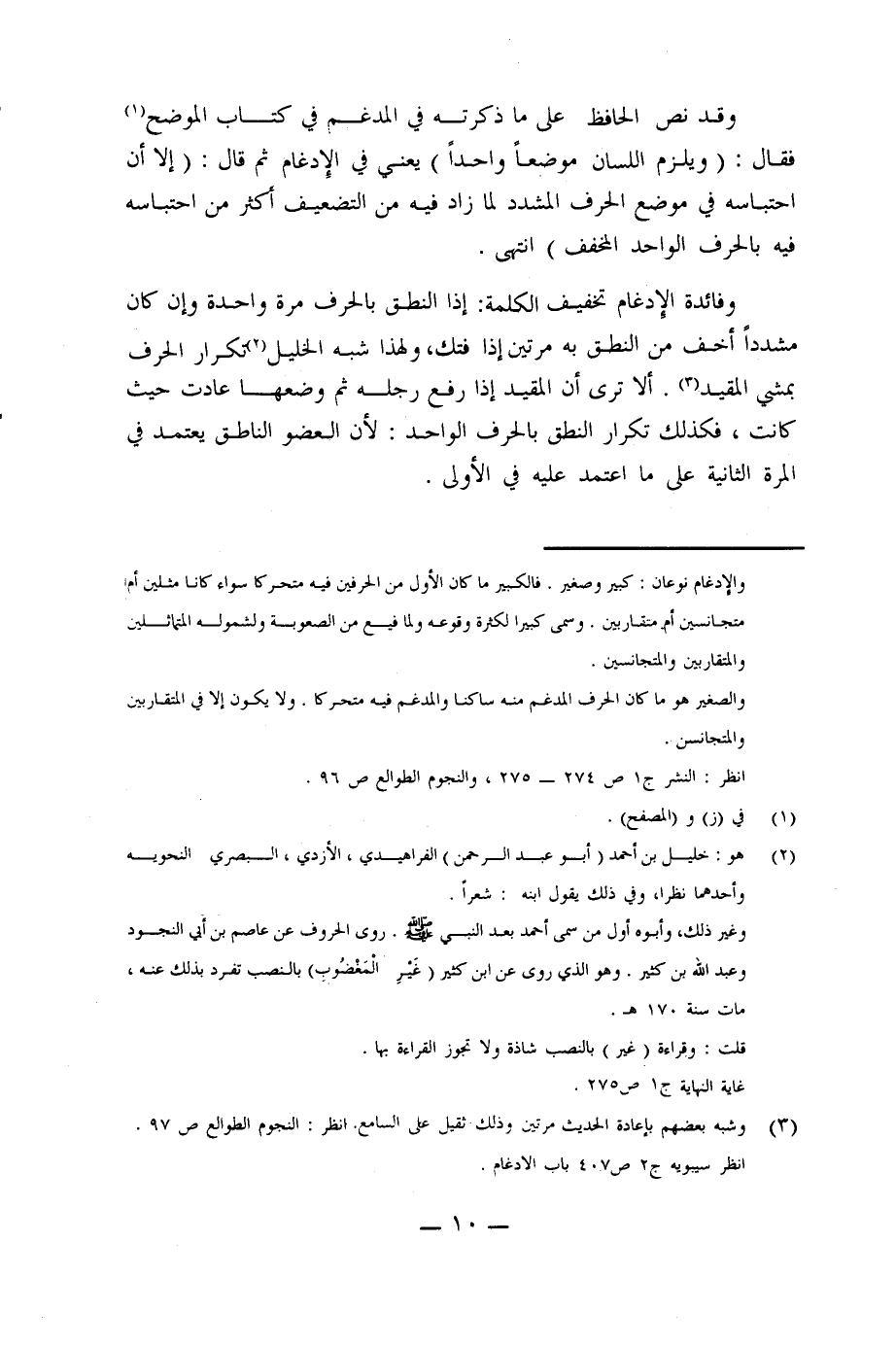 وقد نص الحافظ على ما ذكرته في المدغم في كتاب الموضح (¬1) فقال: (ويلزم اللسان موضعاً واحداً) يعني في الإِدغام ثم قال: (إلا أن احتباسه في موضع الحرف المشدد لما زاد فيه من التضعيف أكثر من احتباسه فيه بالحرف الواحد المخفف) انتهى.