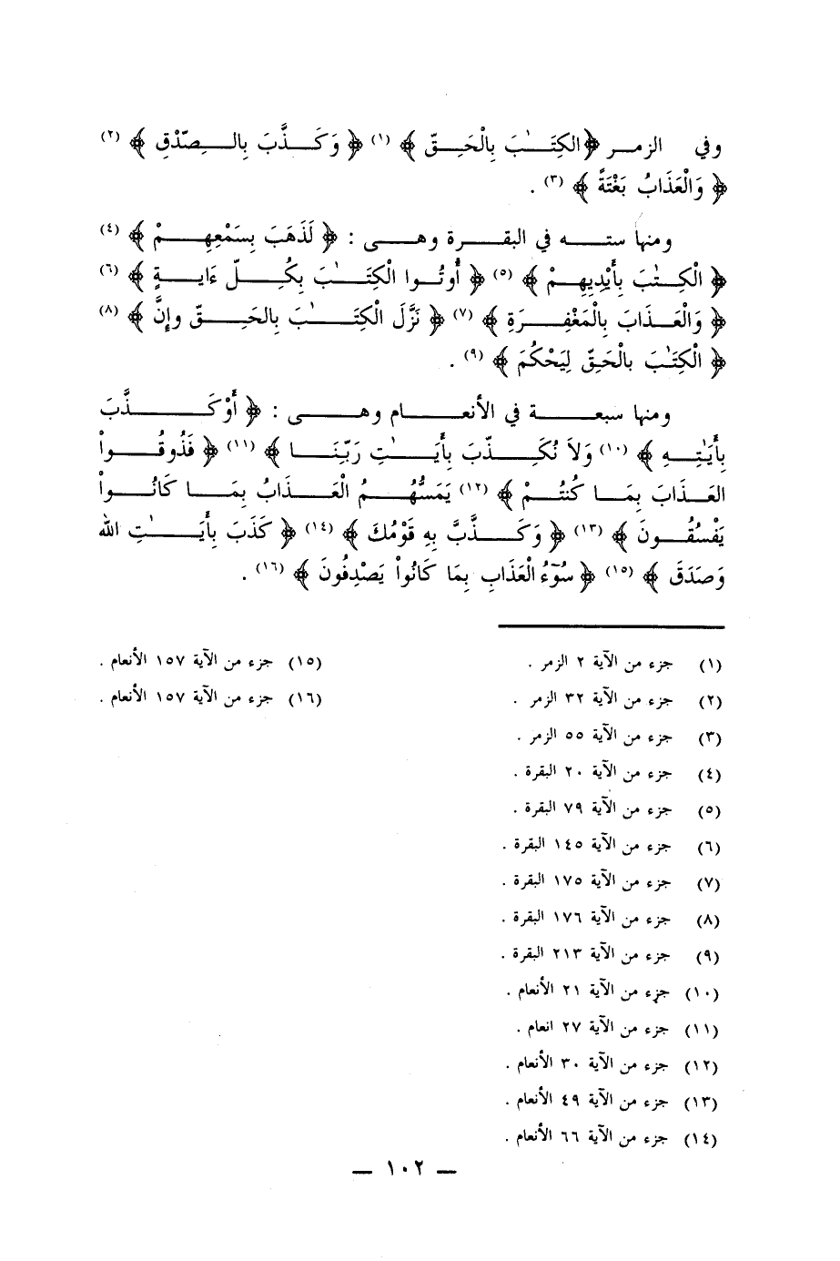 ومنها ستة في البقرة وهي: {لَذَهَبَ بِسَمْعِهِمْ} (¬4) {الْكِتبَ بِأَيْدِيِهِمْ} (¬5) {أُوْتُواْ الْكِتَابَ بِكُلِّ آيَةٍ} (¬6) {وَالْعَذَابَ بِالْمَغْفِرَةِ} (¬7) {نَزَّلَ الْكِتَابَ بِالْحَقِّ وَإِنَّ} (¬8) {الْكِتَابَ بالْحِقِّ لِيَحْكُمَ} (¬9).