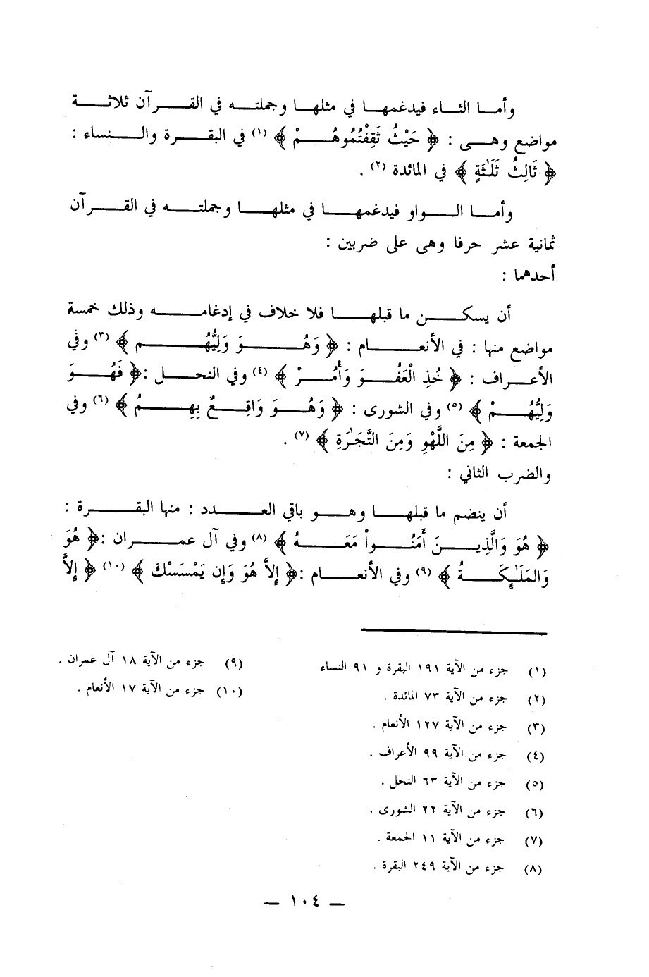 وأما الواو فيدغمها في مثلها وجملته في القرآن ثمانية عشر حرفا وهي على ضربين: