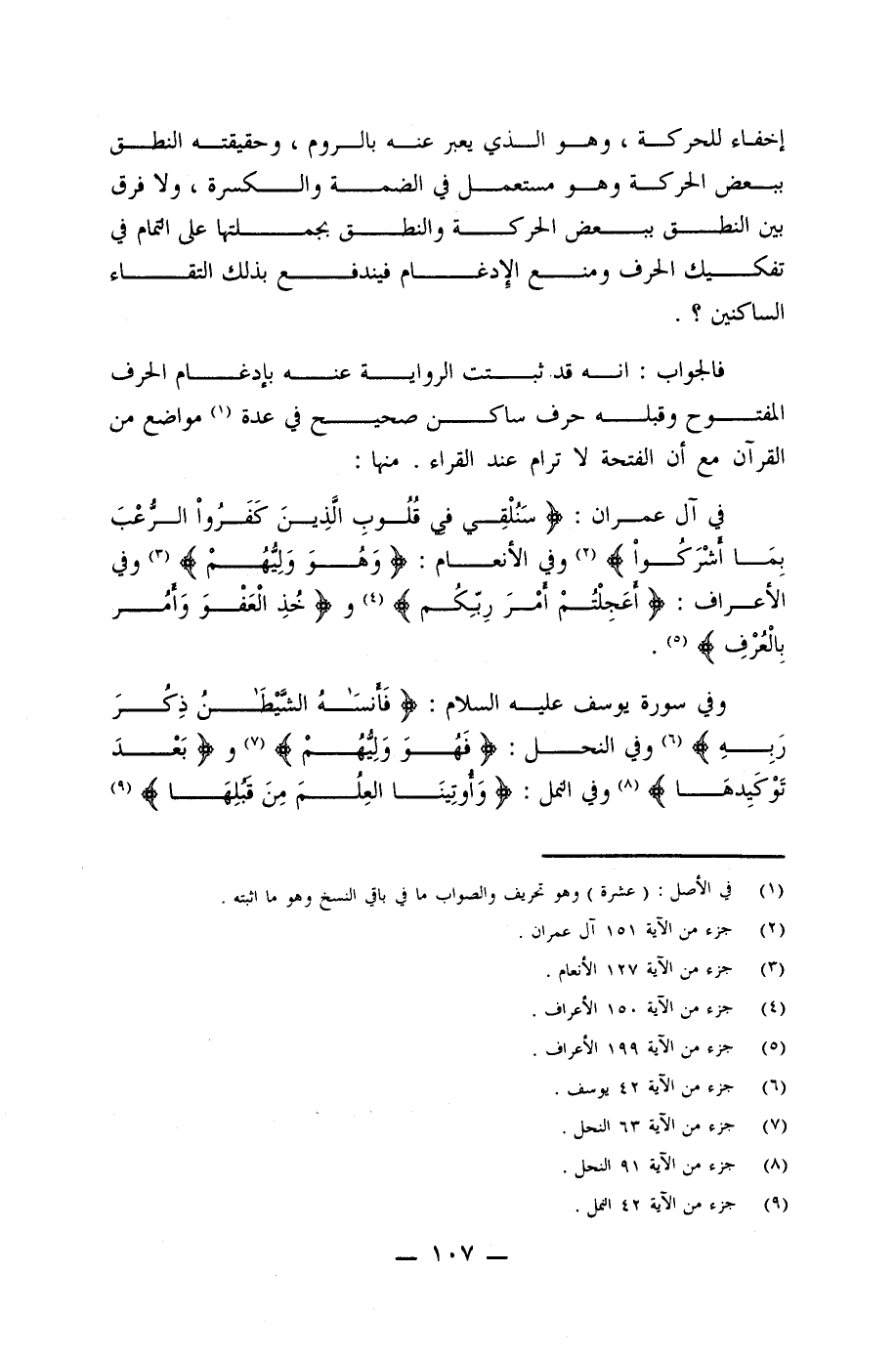 فالجواب: أنه قد. ثبتت الرواية عنه بإدغام الحرف المفتوح وقبله حرف ساكن صحيح في عدة (¬1) مواضع من القرآن مع أن الفتحة لا ترام عند القراء. منها: