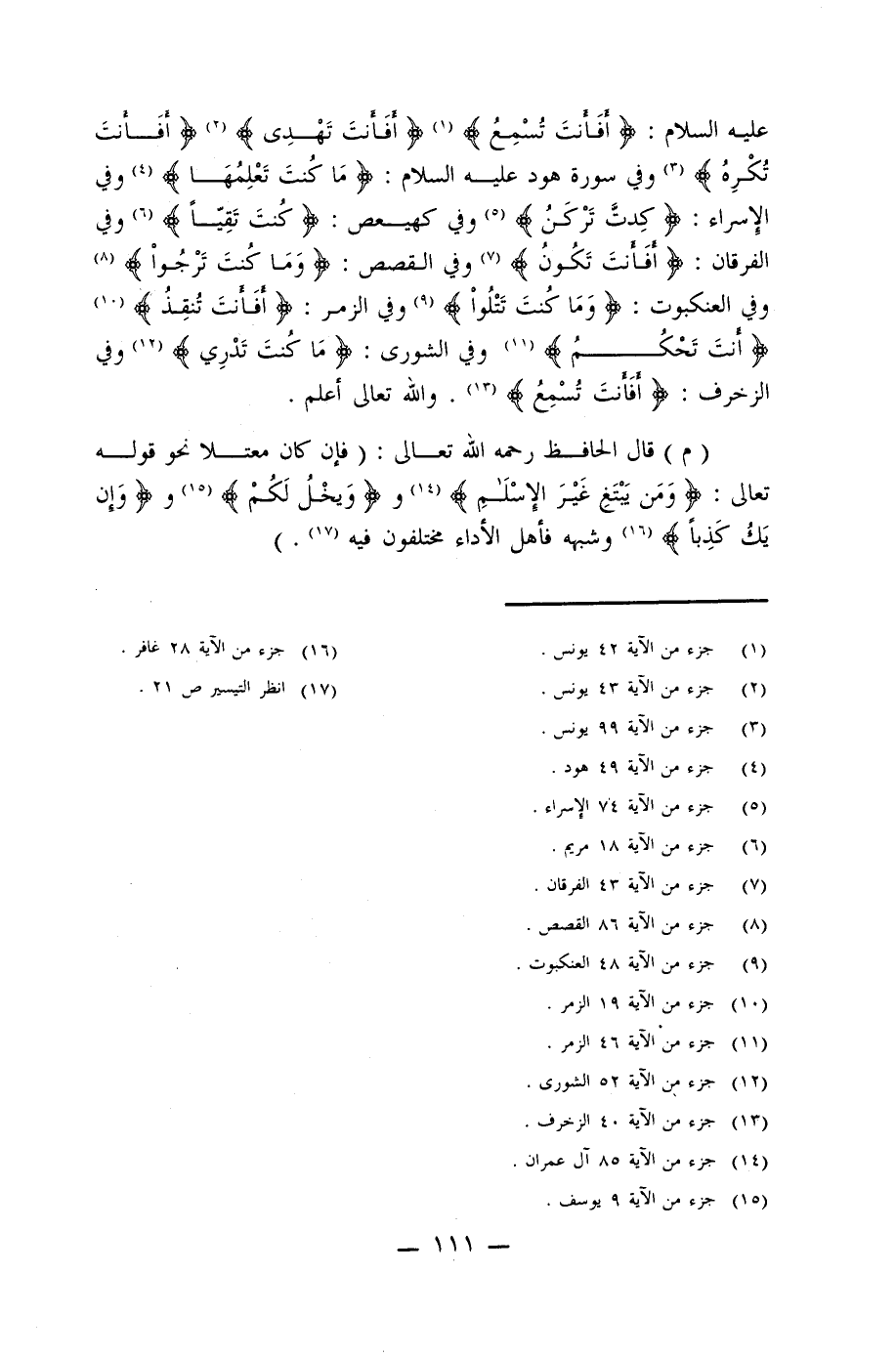- عليه السلام -: {أَفَأَنْتَ تُسْمِعُ} (¬1) {أَفَأَنْتَ تَهْدِى} (¬2) {أَفَأنْتَ تُكْرِهُ} (¬3) وفي سورة هود - عليه السلام -: {مَا كُنْتَ تَعْلِمُهَا} (¬4) وفي الإِسراء: {كِدتَّ تَرْكَنُ} (¬5) وفي كهيعص: {كُنْتَ تَقِيًّا} (¬6) وفي الفرقان: {أَفَأَنْتَ تَكُونُ} (¬7) وفي القصص: {وَمَا كُنْتَ تَرْجُواْ} (¬8) وفي العنكبوت: {وَمَا كُنْتَ تَتْلُواْ} (¬9) وفي الزمر: {أَفَأَنْتَ تُنقِذُ} (¬10) {أَنْتَ تَحْكُمُ} (¬11) وفي الشورى: {مَا كُنْتَ تَدْرِي} (¬12) وفي الزخرف: {أَفَأَنْتَ تُسْمِعُ} (¬13). والله تعالى أعلم.